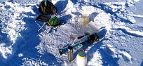 В среду расположились на одной из ямок по руслу. Глубина в ямке 5 – 5,3 метра, по правой верхней бровке несколько спиленных пеньков. Сразу просверлили...