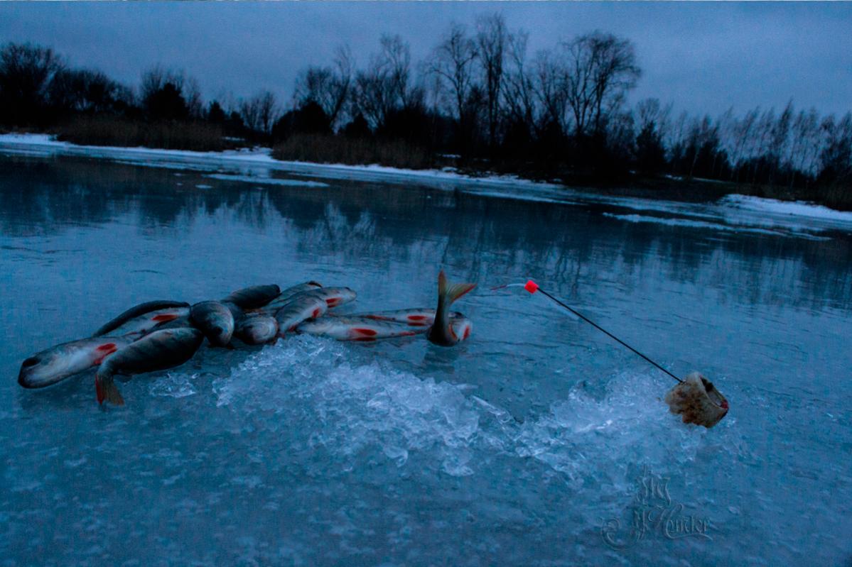 В общем, в единственный выходной как всегда влупил мороз. Когда выезжал было -17. Не очень радостный факт, но желание попасть на рыбалку преобладало над инстинктом самосохранения) К первому месту доехать не вышло, так как выпало много снега, поэтому, немного потеряли времени на переезд. Приехали на интересное разветвление проточного старика, на котором у меня уже был опыт ловли в прошлом сезоне. С собой брал только основное, поэтому, налегке приступил к поиску рыбы. Ничем хорошим данное действие не закончилось, поэтому в голову стукнула мысль идти и искать. В общем, пролазил я со своей безмотылкой 9 километров, и к обеду, в надежде на вечерний выход, вернулся назад. При этом пустой. По приходу услышал, что мужики между собой говорят о частых поклевках щупарей, поэтому дабы не терять по тупости мормышки, перевязался на темную. Немного поиска и увидел первые поклевки. С одной лунки поймал трех окуней и одному хорошо дал по морде, после этого он, видать, обиделся не на шутку и лунка затихла. Еще десять минут ловли и стало ясно, что окунь кормится ближе к берегу, и перепад глубины даже на пол метра, грозил зря потраченным временем на безрезультатные проводки. Чем больше вечерело, тем мельче места срабатывали. При этом свежие лунки не давали результата, так как ото льда до дна было около 30-40см.