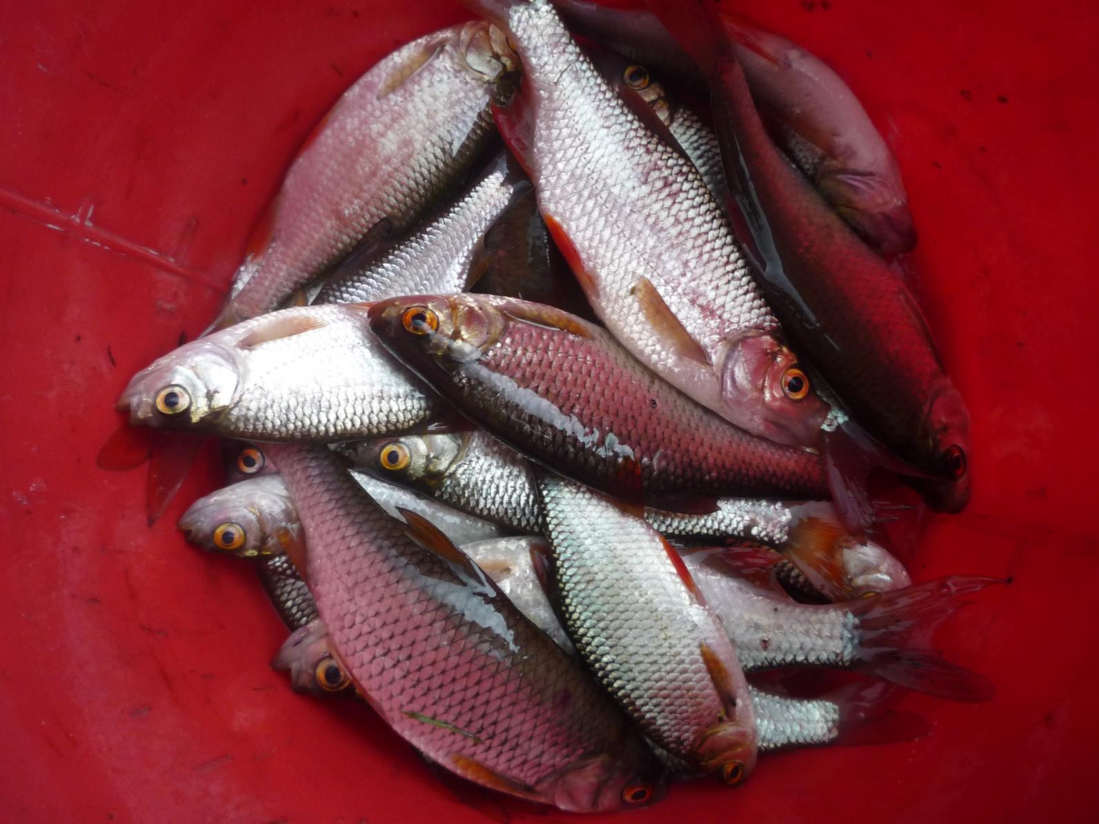 Хищные снасти в машину,удочку и прикормку в лодку. Закормил окно в оставшихся водорослях и минут через 15 "пошло". Равномерный клёв был до самой темноты. Работали опарыш и перловка (взятые у друга на берегу). Крупная уклея, средняя и шикарная речная плотва и краснопёрка (заставляющая вздрагивать и браться за подсачек),живцовой мелочи было штук 20 (пошли в ведёрко для следующего знакомства со щуками). Заскочили на веселуху и четыре карасика около-500 граммовые.Около 17-00 пошла одна отборная краснопёрка.