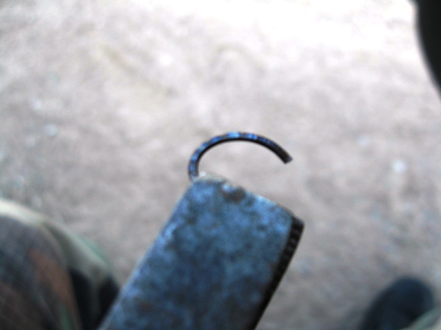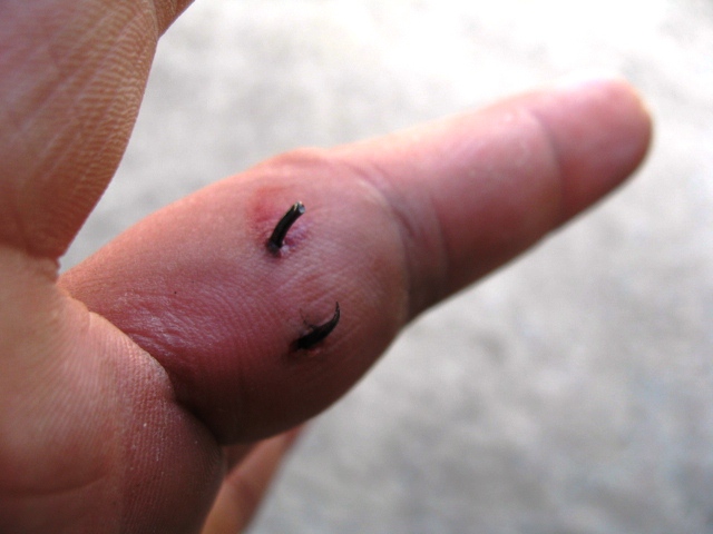 2. В случае, если в течении 10-15 минут крюк категорически не желает освободиться от пальца, протыкаем палец крюком ещё раз так, что бы показалось жало