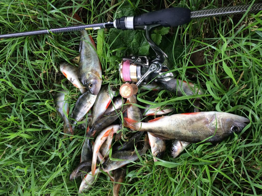 • В воскресенье случилась спонтанная рыбалка. В Трумпах с другом удалось окуня половить. На воду вышли уже ближе к 8 утра. Сразу же нашли точку где полосатый себя проявил. Очень капризничал, стоял разрозненно и после касания приманки не хотел её доедать. Начался перебор приманок, анимации. Окунь стал ловится, но в основном спортивного размера. Кое как уговорил товарища сменить точку. Что не очень-то просто когда клюет. На новом месте окунь был гораздо крупнее, но такой же капризный. Постепенно выяснили, что безоговорочной лидер дня из приманок tioga 2" в цвете 033. Этот силикон полосатый буквально рвал на кусочки. И конечно же по закону подлости была всего одна начатая далеко не полная пачка. Остатки которой быстро закончились, а бесхвостые тиоги окунь категорически отказывался есть. Не однократно, в том числе и в самый активный клев, пробовали ставить другие приманки, поклевок становилось намного меньше, вплоть до полного отсутствия. И обычно хорошо работающая RVR слиж не работала вообще. Пик клёва пришелся на самый ливень. Промокли до нитки, т.к. собирались впопыхах и ничего непромокающего с собой не взяли. Часам к 12 и так не очень активный клев стих. По упирались еще и в 14 выплыли.