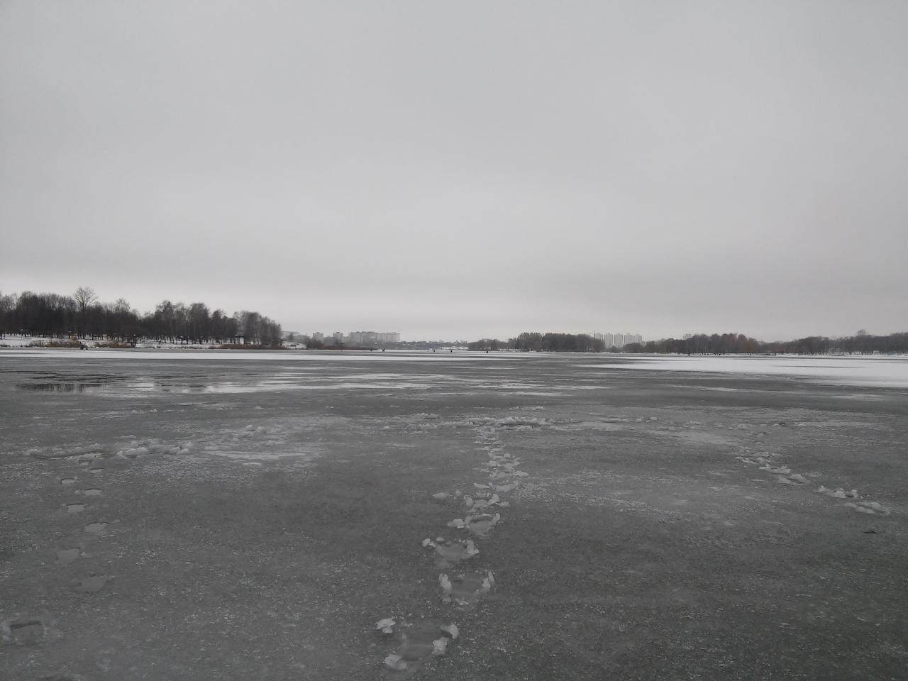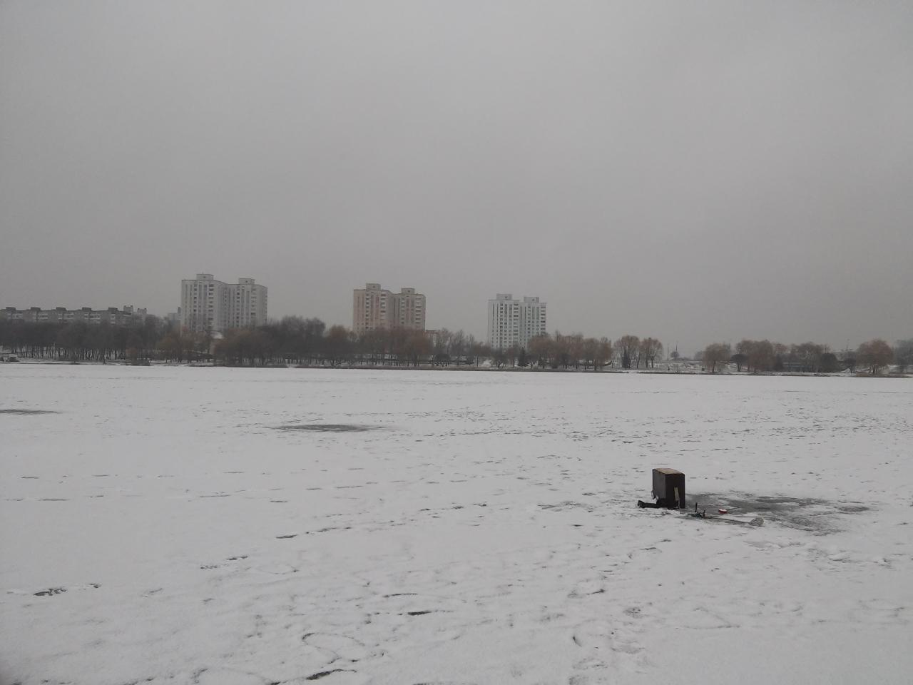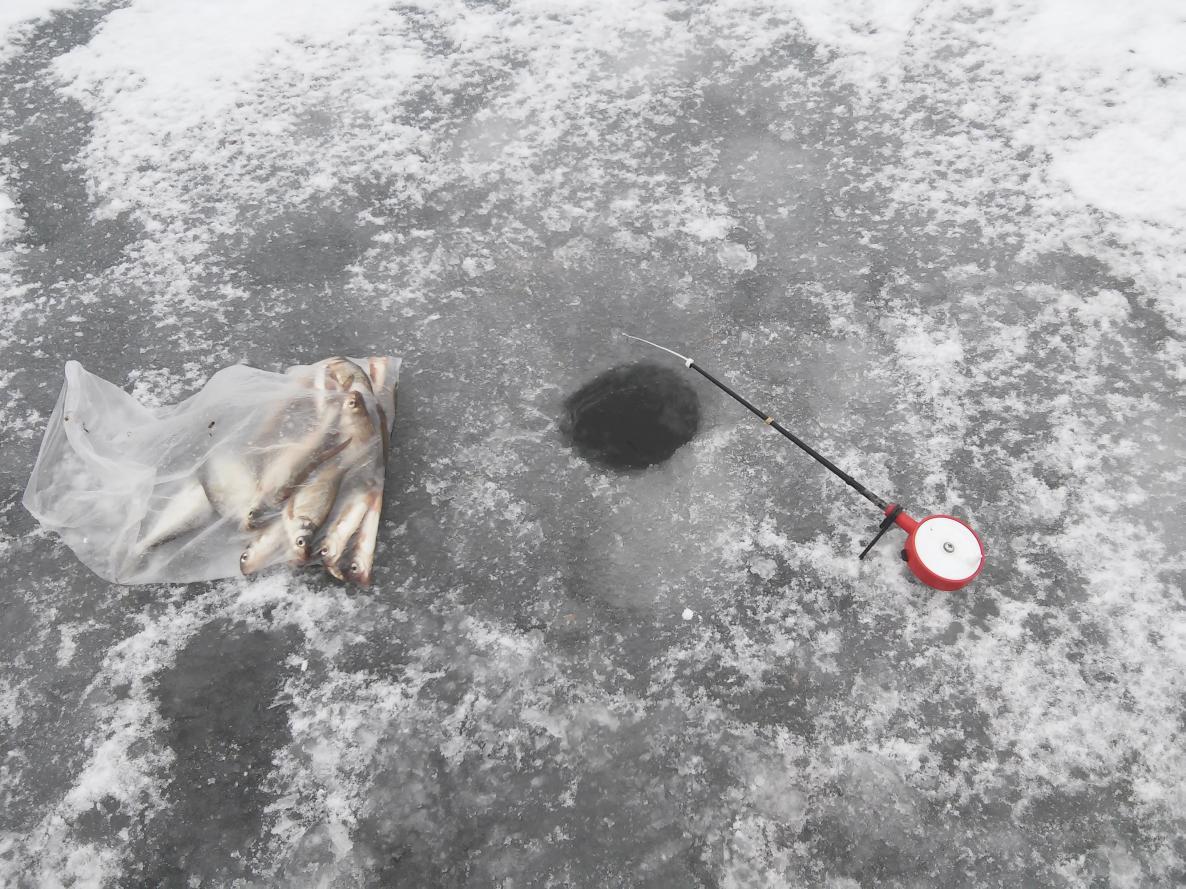 Вышел из дому еще затемно. Проходя дамбу увидел, что кто-то ловил на фидер. Хотя от дамбы лед отошел буквально метров 15-20. В темноте. Да, уж. Ну, это его дело. На льду уже были люди, но мало. Мое место было свободным. Вчерашних лунок всех не нашел и пришлось некоторые делать новые. Закормился. К 10-11 часам на водоеме было примерно 35-40 человек. Основная масса людей была напротив спасалки и между островами. Но клев сегодня был намного хуже. Даже на игру. Ближайшие рыболовы от меня даже поклевки не увидели. После обеда многие ушли, а остальные стали кучковаться и передвигаться по водоему в поисках рыбы. Я взял сразу неплохого ерша. Затем был только подлещик. Максимальная серия из 3 штук. Клев был не очень. Хотя вчера более-менее нормально. Лед от 10см под берегом до 5см на русле. Без знания водоема лучше не идти. За день взял всего 16 подлещиков (3 штуки отдал другу) и 1 ерша. На игру все изловлено. Другие хуже - 2-7 рыбок или вообще ничего. В принципе, нормально. Не за рыбой идем, а отдохнуть от суеты. Всем звенящей лески в руках!