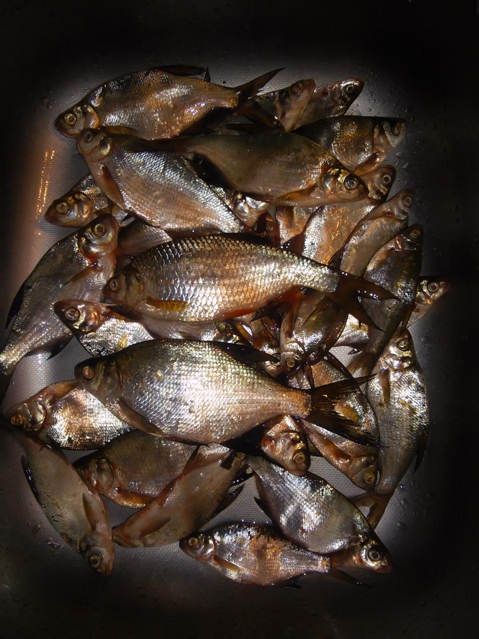 Не спеша выдвинулся из дома, прошел дамбу и около пирса рыбак под берегом делал серию лунок в надежде поймать на блесну окунька или щучку. Он также выставил серию ставок вдоль тростника - к вечеру увидим результат. Чуть дальше ловил мужик и уже тягал подлещиков. Ловил он на этом месте со среды, постоянно кормил и средний улов у него был 4кг разнорыбицы (+ бонус плотва на 500гр.). Я не видел, но верить можно - мужик он солидный. Ну, а я пошел дальше на свое место. Сделал серию лунок, закормился и почти сразу исключительно на игру без поплавка начались поклевки подлещика. Максимальная серия из 3 подлещиков. На стоячку не очень. Пару рыбаков недалеко от меня взяли по 5-8 рыбок, но они ловили с поплавком и без подыгрываний. Один из них в конце дня взял леща-бизона на 1,5-2кг (фото не сделал). Клюнул как мелочь, тянул он его 4 раза к лунке, но все-таки взял. У меня из бонусов только плотва одна на 120гр. А так за день взял 32 головы включая плотвицу. Общий вес рыбы 1330гр. Ставочник, к которому я с утра подходил, взял 1 щуку-килошницу и все. На блесну у него ударов не было. Ставочник почти целый день курсировал между немногочисленными рыбаками, рассказывал истории, спрашивал про клев. Рассказал, что в Стайках при ловле на ставки весь живец дохнет. Пришли к выводу, что из-за многочисленных листьев (вокруг одни лиственные деревья) при их разложении на дне очень мало кислорода и живец дохнет и даже карасик еле живой бывает. Короче, нужно искать выход или ловить на других водоемах. Я ловил до 17,30 и что-то еще поклевывало. Хороший денек.