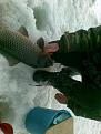 До сего момента не верил, что на ЭТО вообще можно ловить. Тут у меня поклевка -ПОТЯЖКА - блин, дурная тяга. Успел подсечь, кто-то срывает меня с ящика (ок. 110 кг живого веса без зимней амуниции), чтоб удержать и остановить - чуть сдаю удочку вниз и получаю РЫВОК снизу такой, что лечу на колени прямо в кашу снега и воды, а удочка вылетает к соседу в спину. Он ржет, я почти плаваю да еще нога застряла в присыпаной рядом лунке. Короче, когда успокоились, осмотрели снасть - причина схода стала ясна - Мустад №2 разогнут, но не сломлен. Перевязываюсь, и слышу соседа международный универсальный слог. Подхожу, спрашиваю - показывает чешуйку на своем крючке - размер 35 мм. Них.....себе думаю. Через час, около 13-30 опять поклевка у соседа - промах, и тут же я подсекаю свою поклевку - тяга слабее, чем первая но.... в корч. Зацеп - сход.