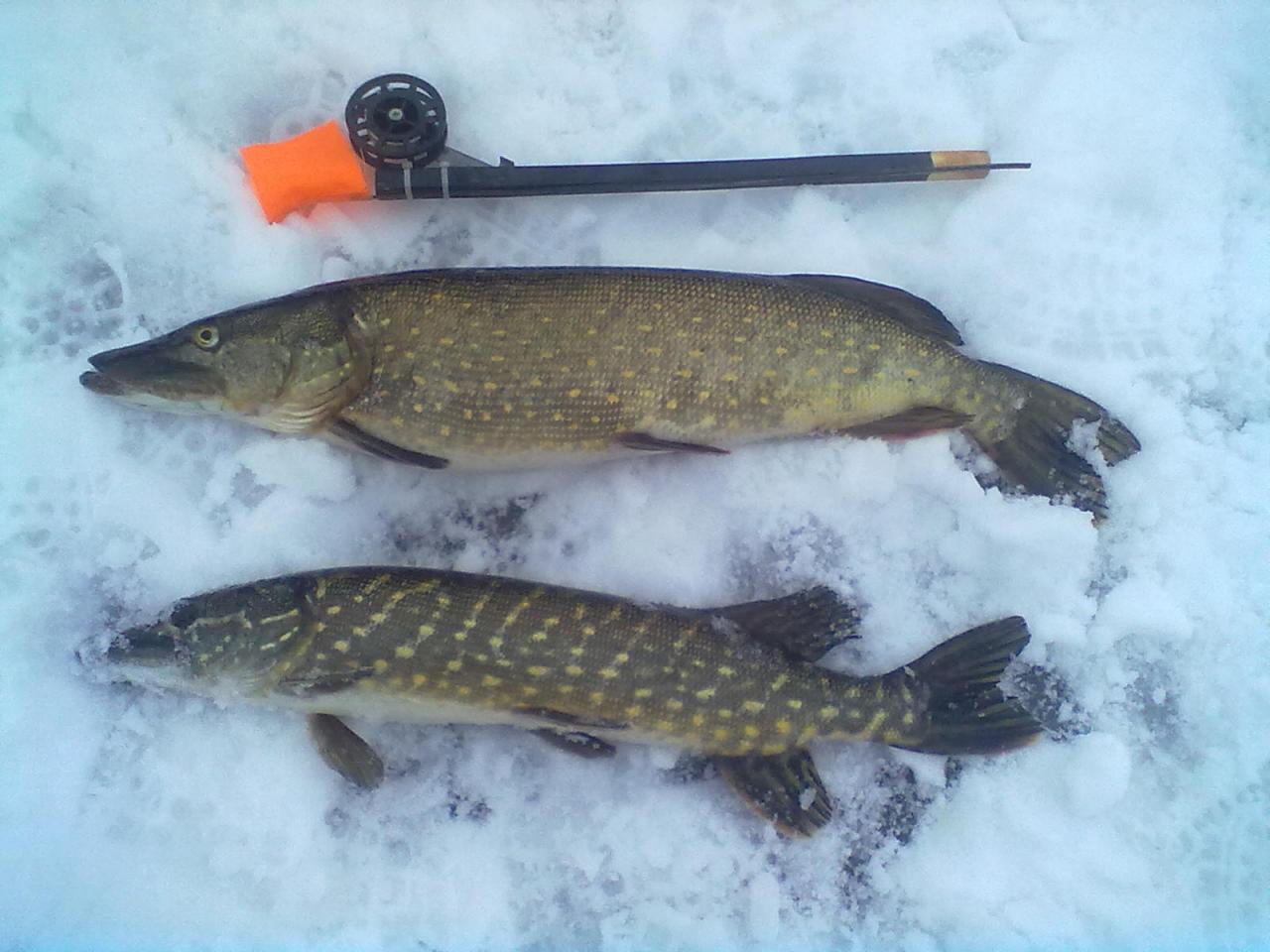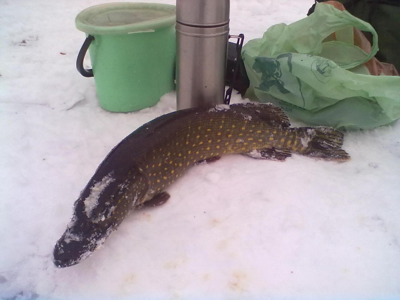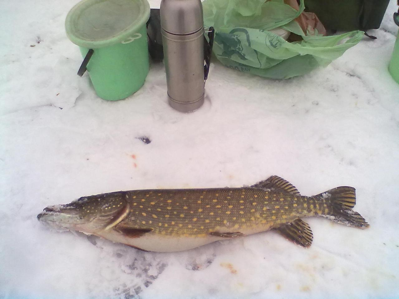 только перекусил ,поднимаю голову горит ставка на пескарика ,подхожу стоит не мотает, думаю бросила, либо ножик либо окунь режет, 5 минут подождал ,смотрю начала дергаться катушка потихоньку, пол оборота и стоит ,потом чуть побольше, и резко -поперла ,подсекаю, тяну - ближе к лунке упирается и все, не могу завести( -изловчился ,в итоге выскочила на лед хвостом вперед, впервые такое чудо было, притом и щучка не плохая ,не взвешивал, но думаю около 3 кг будет