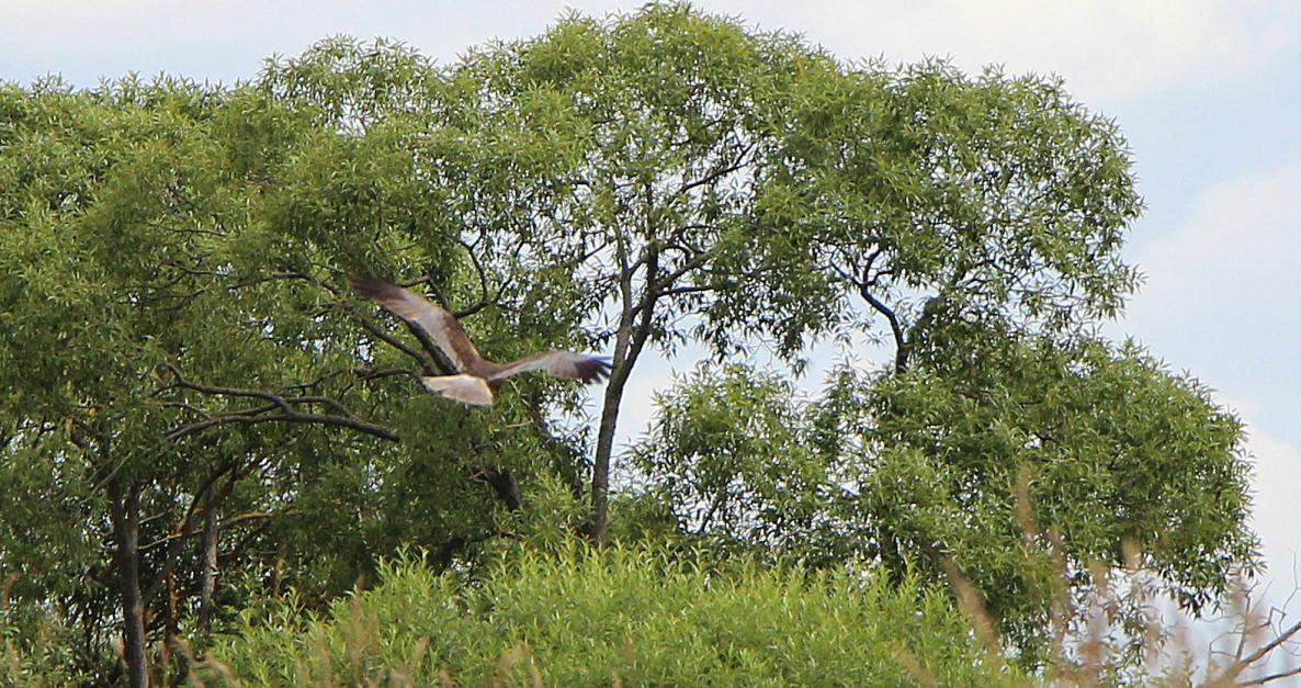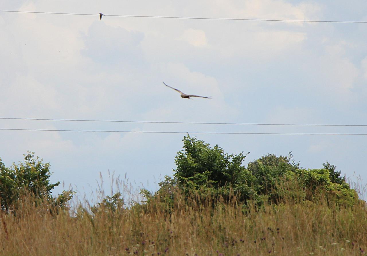 Район мядельский, недалеко река, луг. Птица вяло кружила низко, небольших круга 2-3. Размах крыльев показался значительным, побольше, чем у аиста, но, местность холмистая и масштаб мог сбиться. Я предположила, что а) лунь луговой б) лунь болотный.