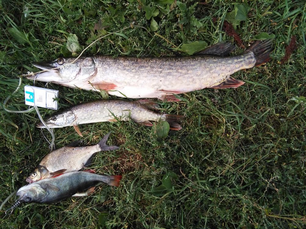 С утра со спиннингом по другим местам, изловлено 4 щучки (1 взял) и пару сходов. Уровень воды очень низок -постоянно цепляется трава.