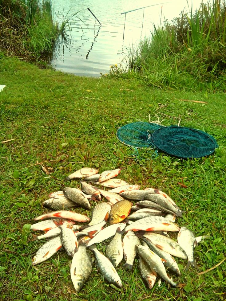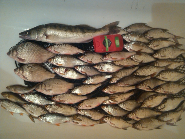 Итог: 1 судак, 3 карася, 24 плотки, 21 лещара, окунь,ерш и 2 рака(клюнули на опарыша и тянулись как кирпичи)))