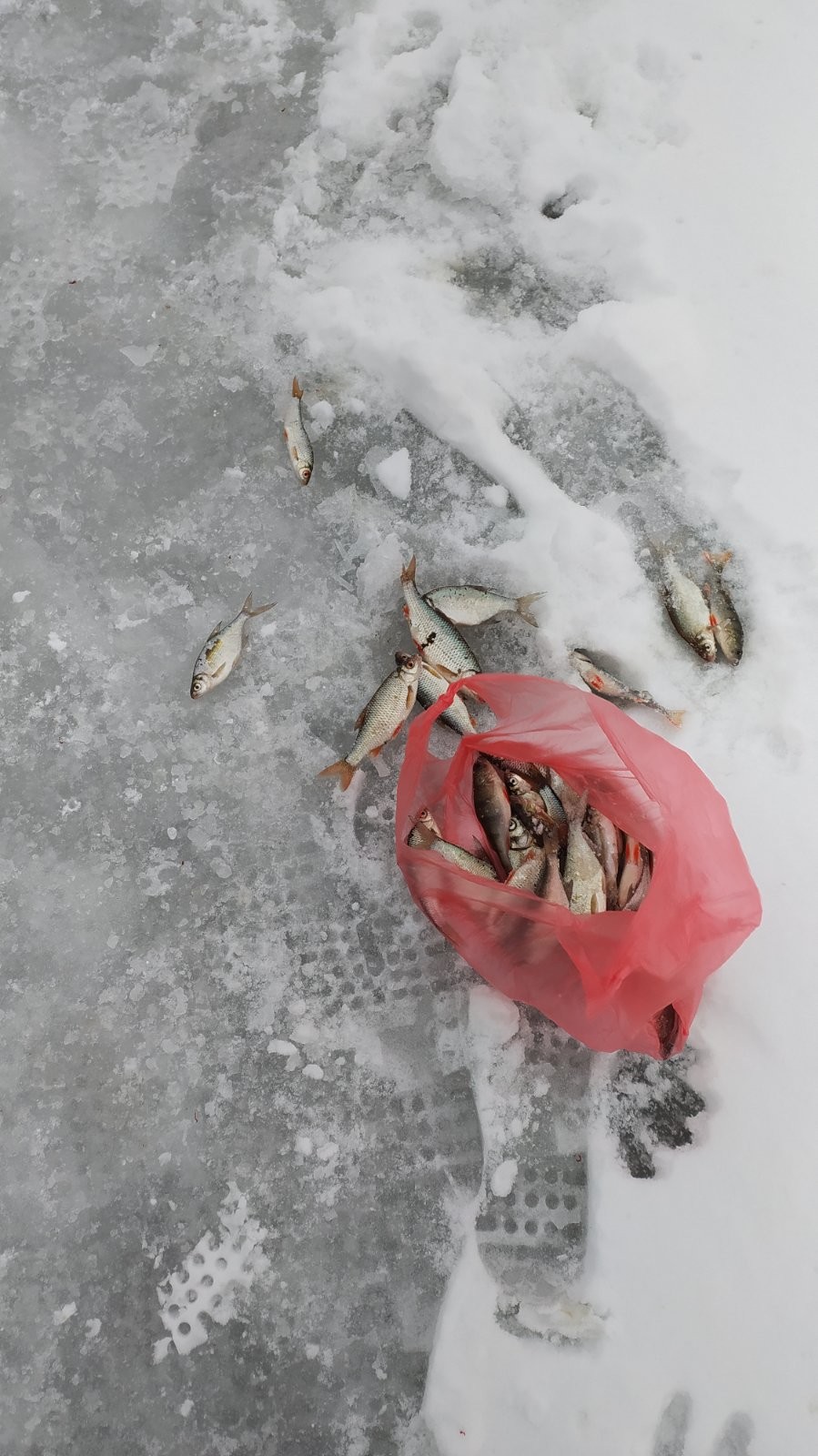 Думал куда сегодня поехать, чтобы не далеко, решил посетить Криницу. Народу было многовато, но мест хватало. Где я обычно ловлю было свободно, но как потом оказалось, ловил в этом месте по щиколотку в снежной каше, можно было выбрать место и посуше. Лёд сантиметров 20, но сверху сантиметров 7 снега и под ним вода и довольно много, походивши получались лужи. Санки по снегу тянуть было тяжеловато, благо не далеко. Засверлил 9 лунок, но решил закормить только 6. Лёд мокроватый, сверился тяжело, с трудом проворачивал бур 130. Глубина 2,8 м. К 9,30 закормился. Ловил на игру мормышка- мотыль, леска 0,069. Первые два круга не дали ни одной поклёвки. Затем с большими усилиями удавалось уговорить одну рыбку с лунки и это были небольшие окушки, а закармливался на плотву. Но плотва на закормленных лунках молчала, перепробовал все проводки. Решил для интереса проверить не кормленные лунки. В итоге за рыбалку словил 7 небольших плоток и все на этих лунках, на кормленных полтора десятка небольших окушков. Почему так получилось с плотвой не пойму, прикормка проверенная, с добавлением лиманника, все как обычно. Большая часть рыбаков с часу начала активно расходиться. Я ушел в 15, когда поклёвки совсем затихли. Погода для рыбалки была отличная, без ветра и сильного мороза. Хоть и рассчитывал на лучший результат, но удовольствие от рыбалки все равно получил чего и всем желаю.1 Фото