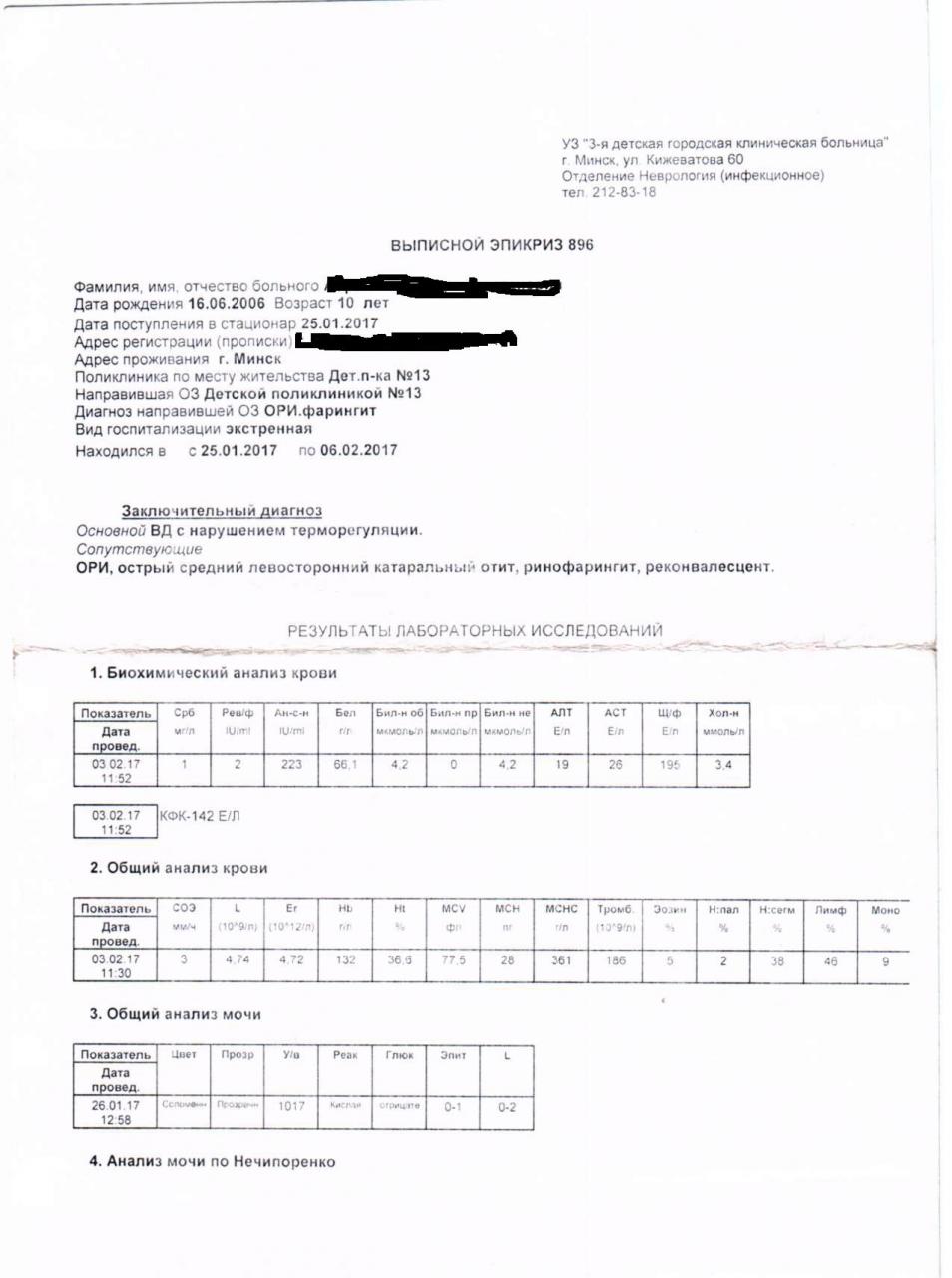 В середине января у ребёнка обнаружили температуру. Цифры доходили и до 41,8 - температура постоянно прыгала. Симптомов никаких! Ребёнок бодрый и здоровый! Тело не горячее! Температуру померили случайно! В поликлинике поставили ОРИ фарингит. Лечились "супраксом". Динамики не было. Положили в отделение неврологии 3-ей детской. В первый день заболело ухо левое. Поставили отит, лечили амоксицилином. Там же в больнице была рвота с болями в животе (предполагаем, что отравление). Выписали с диагнозом ВД с нарушением терморегуляции. Температура оставалась, но уже не более 39. Дома заболело левое ухо, периодически побаливало и правое - ЛОР отит не поставил. Боль не острая. Неделю принимали азитромицин, сосудосуживающие капли, капли с антибиотком в нос, отинум в уши. Температура на данный момент: в левой подмышке - 37,7; в правой - 37,4; во рту - 37,1.
