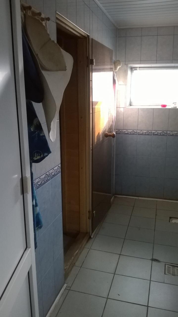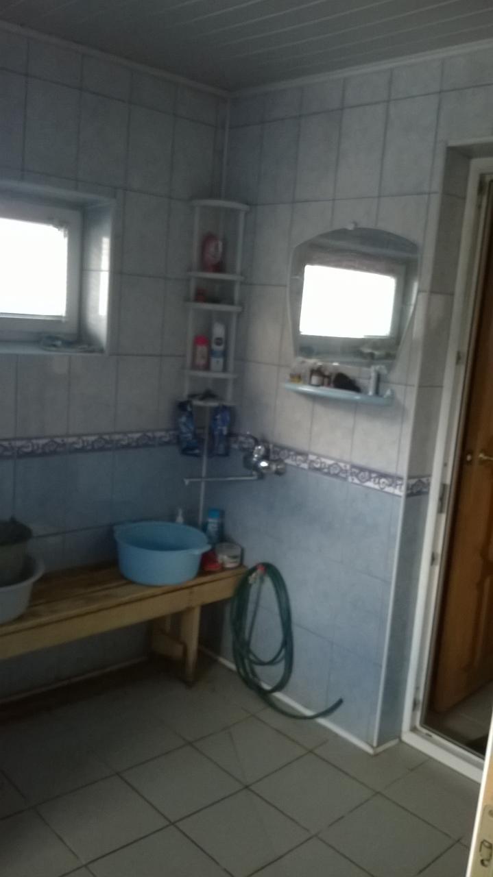 Из раздевалки попадаем в помывочную. В помывочной 2 душевых места, в принципе если баня на 3-4 человек то хватает и одного места. Очень нужная штука скамейка и смеситель с дюбай, удобно бывает тазик с водой в парную набрать, веники запарить.... . Соски душевые лежат на полу, это вода из стояков слита. Будет топится баня соски поднимутся.