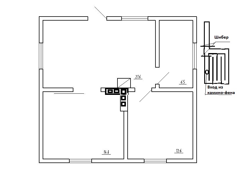 Вход в щиток должен быть слева, а над ним дымоход.