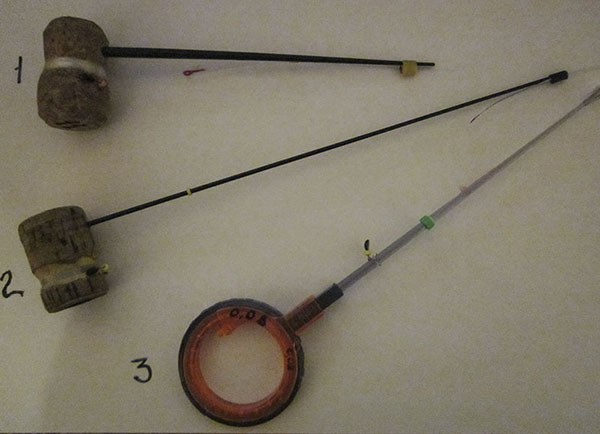 Удочка под номером 2. Корпус - отрезок от рукоятки поломанного спиннинга. Хлыстик - отрезок верхней части верхнего колена углепластиковой летней удочки. Приобретен в магазине. (Как недостаток такой конструкции - цена).