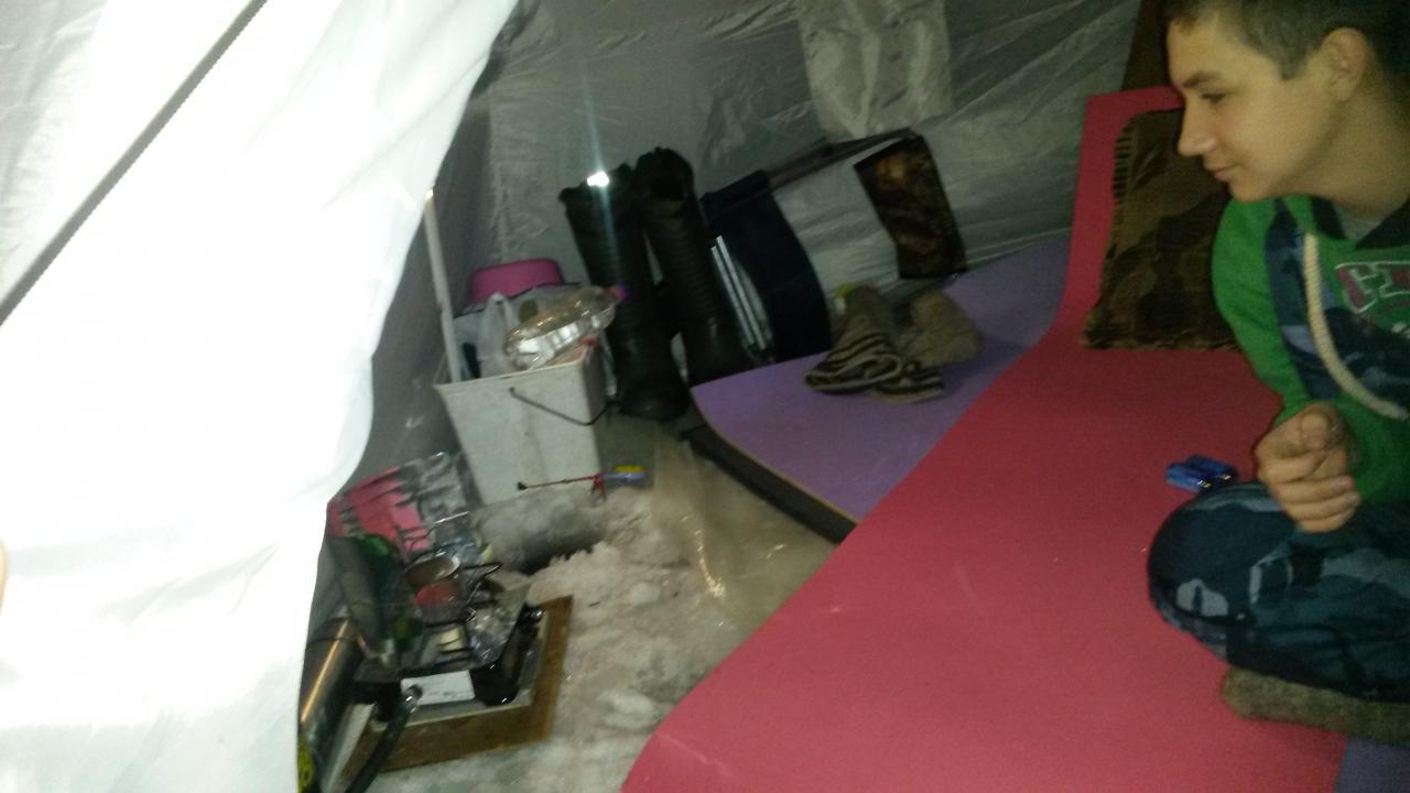 В палатке температура на полу от +15 и выше, вот в таких условиях можно спокойно рыбачить и 2-ое и 3-ое суток.