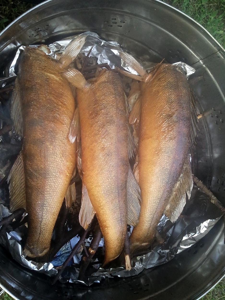 На рыбалке в наших широтах, кроме угря, в коптильне наиболее сногсшибательно выходит сом, при чем мелкий, до 3 кило и лещ. Съедается как теплый, с пылу, с дыму, так и холодный, на завтра. Важное условие при размешении рыбы в вертикальной коптильне - ее обвязка с петлями расположенными на расстоянии 5-7 см друг от друга.