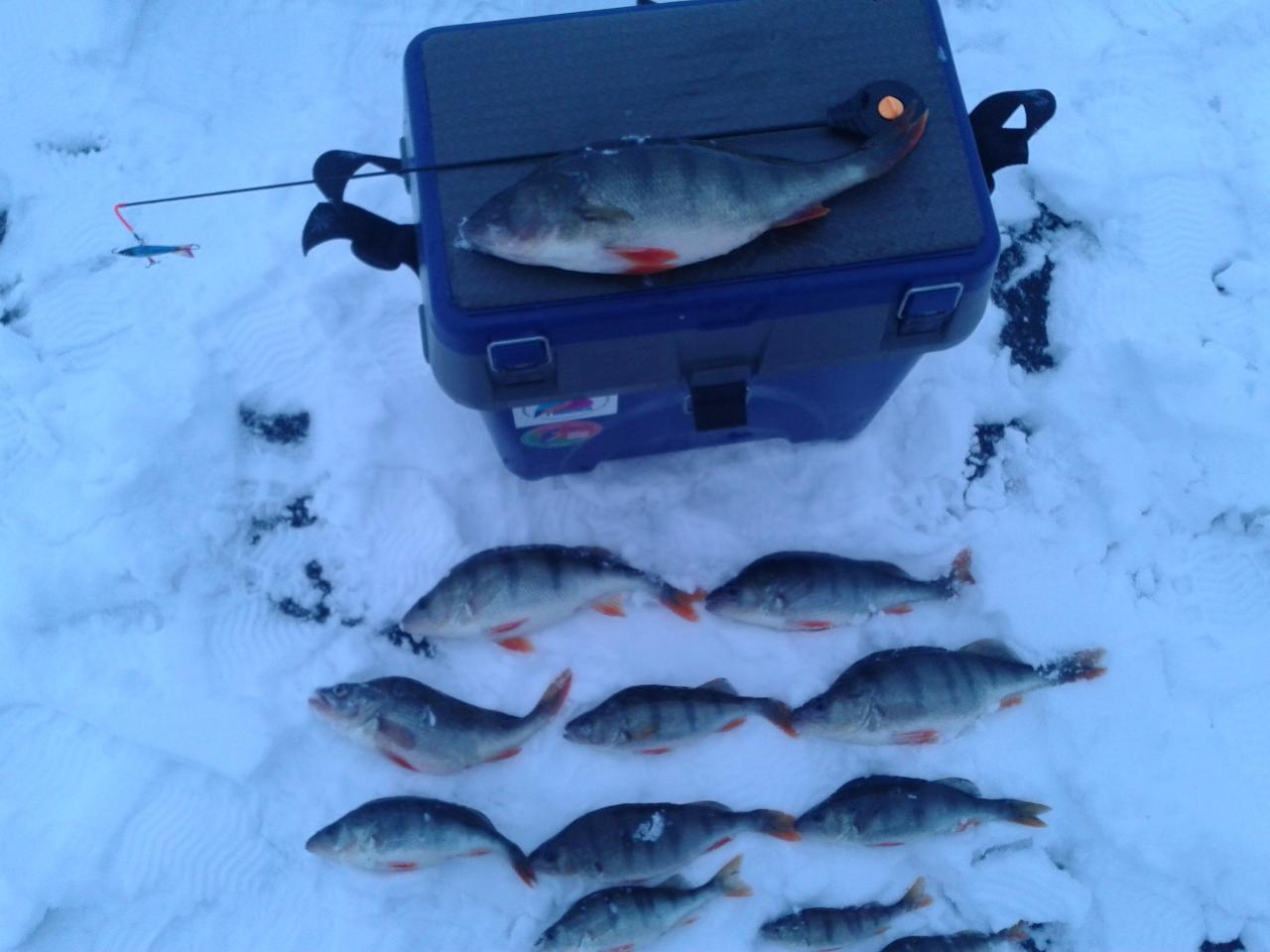 Вчера получилось выскочить на оз. Белое. Толи оттепель, толи ещё что, но стайный товарный окунь, явно в коматозе. За всю рыбалку, вымучил всё то что на фото. Упирался при поиске только в баланс. После поимки рыбы, тычков или подбросов, перепробовал весь арсенал, а именно изменение цвета балансира, уменьшение размера, переход на балду, блёсна и в конце на безмотылку. Окунь пока буксует. Почти вся рыба поймана на балансир, мелочь долавливали блёсна. Балду не брал, безмотылка тоже в игноре. Нет крепких морозов, нет и активного окуня. Глубины 4-5 метров, при основной - 7м. Рабочие глубины от 1.5 до 3м. молчали аки рыба об лёд. Что то не даёт ему активизации. Искал его там где он себя часто проявляет. Что то не то, склоняюсь к мысли, что всё же виной отсутствие морозов. Всем НХНЧ.