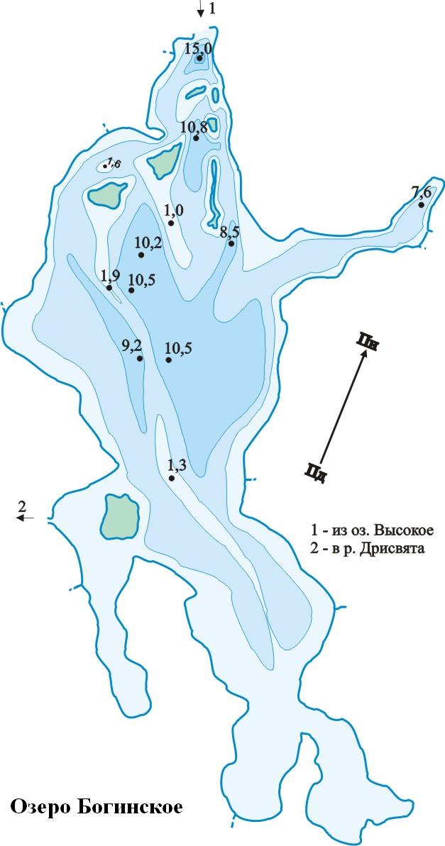 Богинское (бел. Богiнскае): 9,1 х 2,9 км, 13,23 км кв., наибольшая глубина 15 м, 8 островов, два из них - Городище и Терентейка - памятники природы.