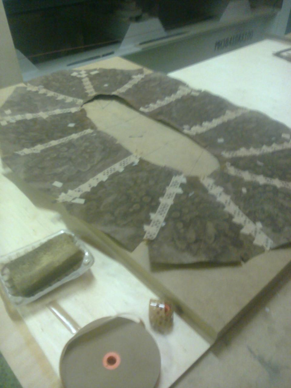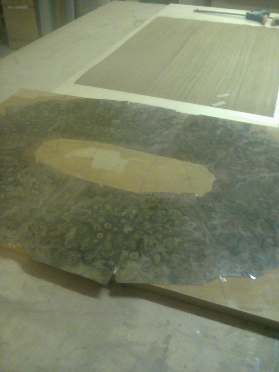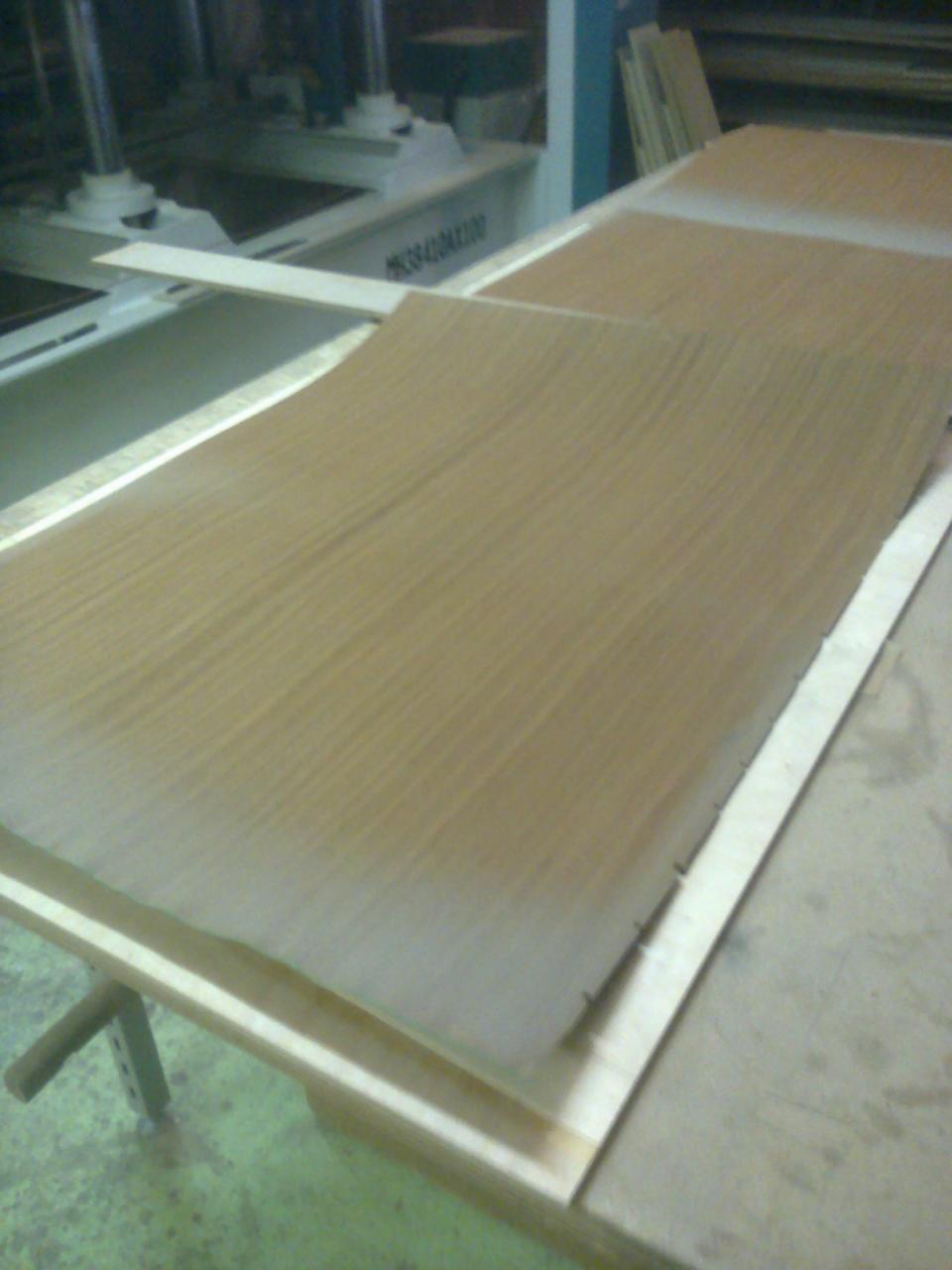 Начинаю делать столешницу. Последовательнопо фото. Вот плита МДФ 25 в плюсовых размерах.ЧПУ расчертит контуры эллипса.И пачка шпона корня.Подбираю рубашку по рисунку. Потом прирезка.Сшиваю рубашку.Мажу МДФ смолой и загоняю все в пресс.