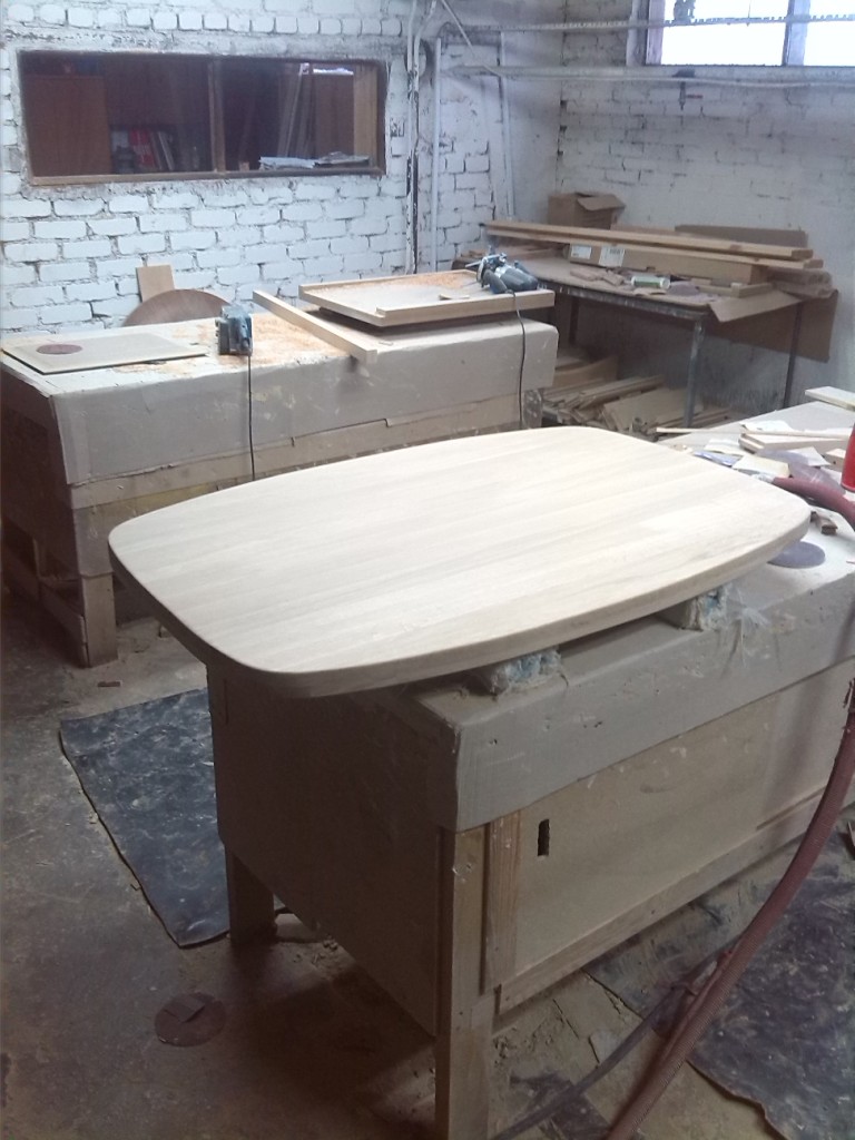 Немного продолжу. Прокрасил морилкой торцы.И на отделку. Первый слой-лак ПУ. Он должен закрыть морилку,иначе полиэфирный грунт сожрет ее со временем. Теперь в сушилку.Залил полиэфиром.До понедельника.3 ФотоПоследний раз редактировалось Евгений Дидух; 01.04.2016, 13:23.