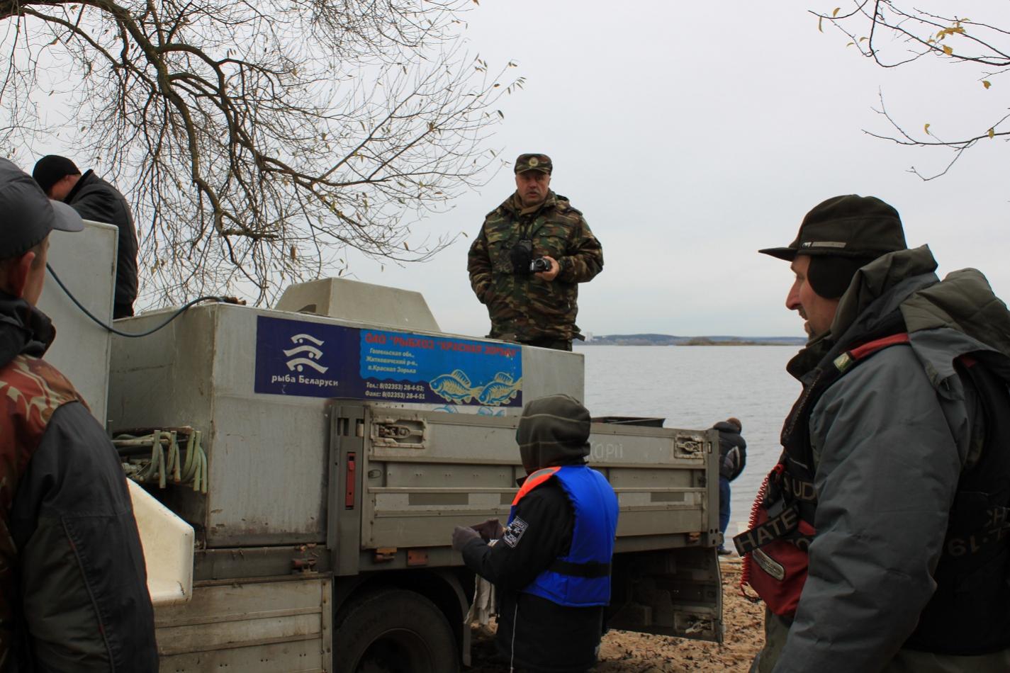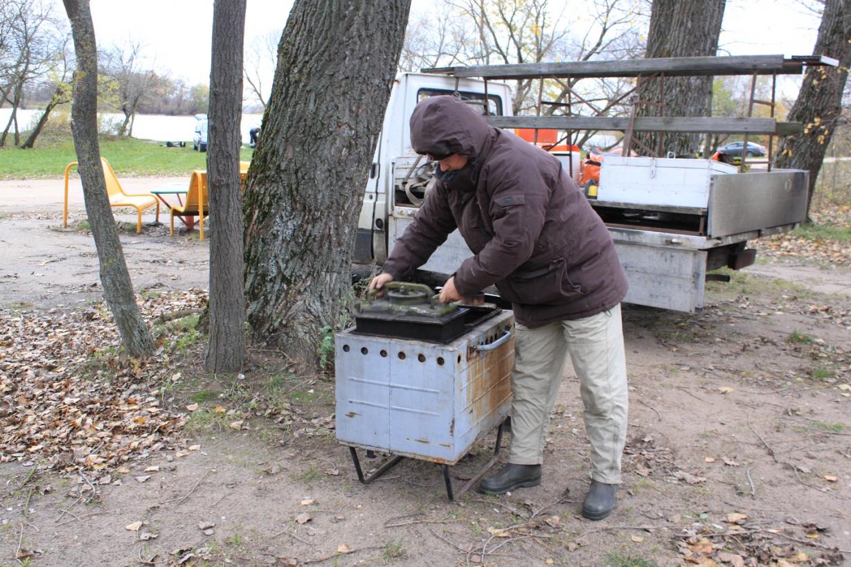 27.10.2012г. В 08.30 живорыбная машина уже на месте, пятый пляж Минского моря. Владимир занялся кухней, покуда подъезжали участники зарыбления: