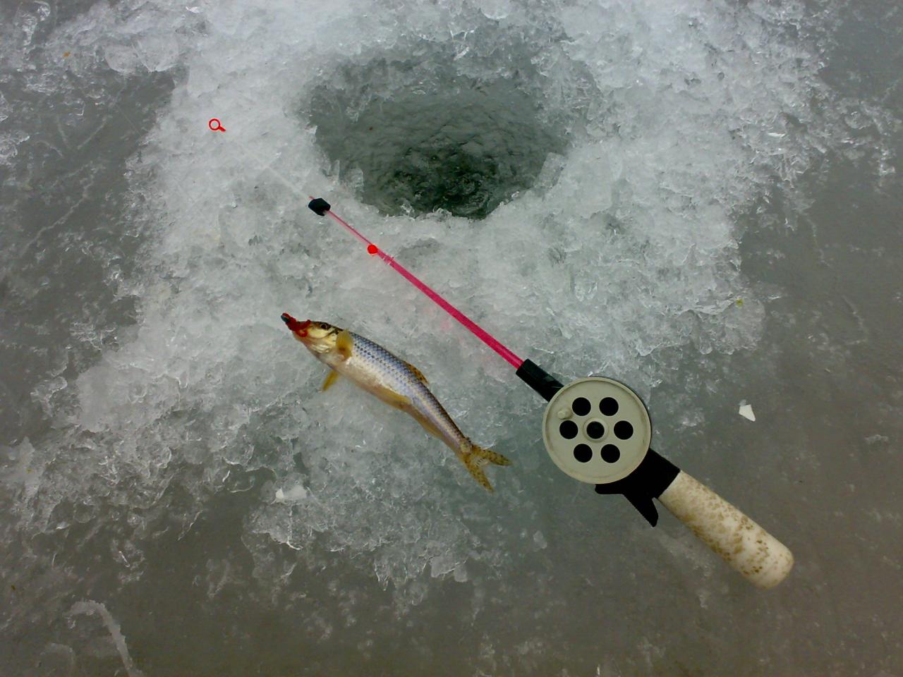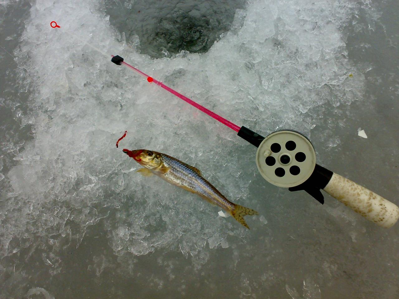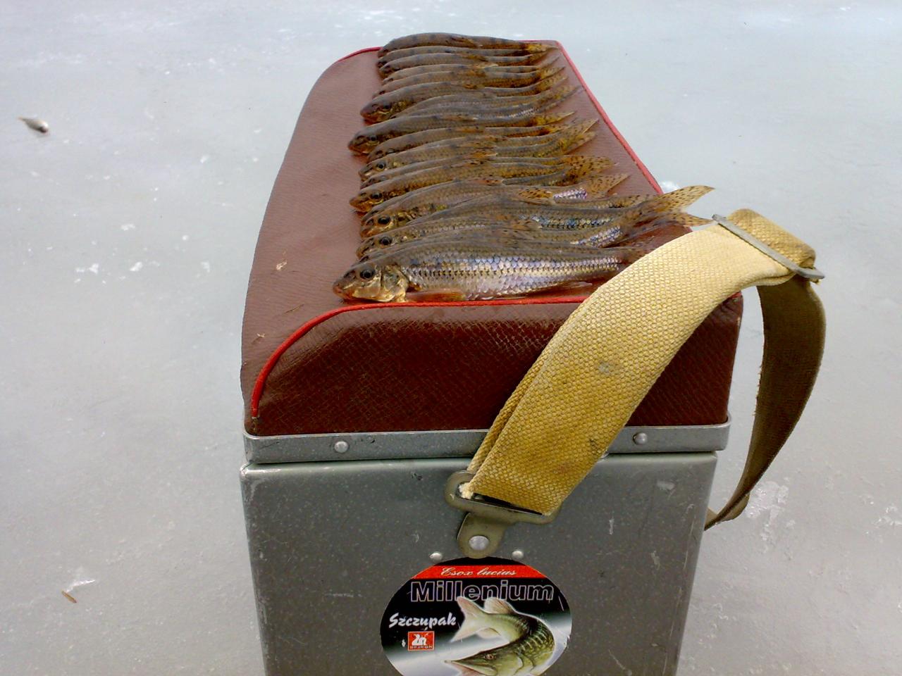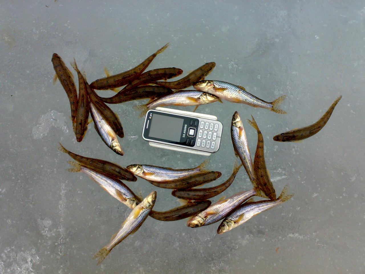 Нашел песчаный бережок, 2 лунки, пару минут и первая колбаска на льду. Поклевки на %20 результативные, а так дурит как может. Изловлено и успешно пожарено порядка 40 шт. за три часа ловли.