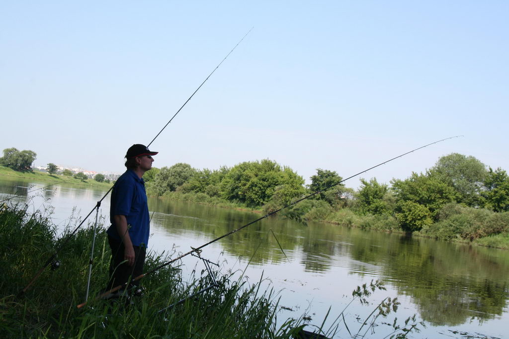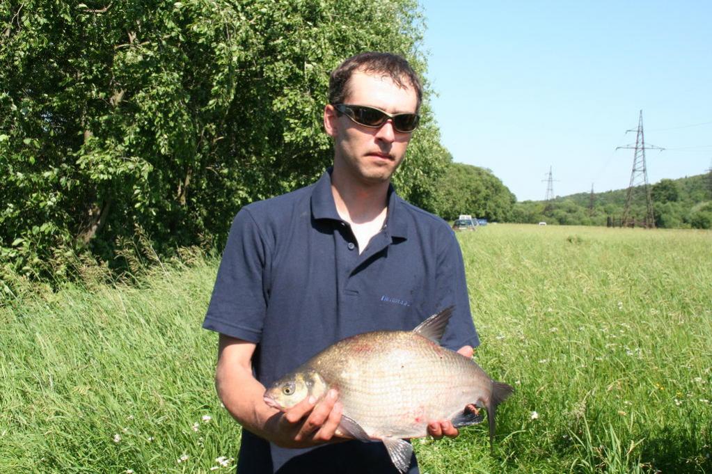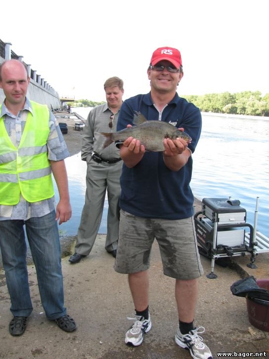 Перед вторым туром на шутливую реплику Билли о том, что Розин заранее знает свой сектор, я ответил – «!7-й!». Каково же было мое удивление, когда по результатам жеребьевки мне снова выпал именно этот сектор. Без сомнения, в эти выходные фарт был со мной. Не смущало меня даже наличие в зоне в качестве соперников наших лидеров – Саш :) - Волкова и Пивоварова. Так как все на месте мне было уже знакомо, я заранее выставил определенную дистанцию лова на обоих фидерах и подготовил к старту 20 «мандаринов». В прикормке я абсолютно ничего не менял. Ситуация в начале тура была копией конца первого, как будто я никуда не уходил - невнятные поклевки и обсосы мотыля. Погода стояла такая же солнечная, но было немного жарче. Несмотря на невпечатляющий старт, я позволил себе немного расслабится, рассматривая великолепные виды Сожа и прислушиваясь к пению хора, доносящегося из храма. Я верил… Лещ клюнул через минут 30 после начала. Перед этим и после было два неплохих, но явно не бонусных схода. Справа Костя Тихонов и Саша Пивоваров регулярно потягивали ладошечников. Я же перепробовав наживки, полностью перешел на мотыля, без подсадок. Мелочь перестала одолевать совсем. Поклевки были редки, но это была или довольно крупная густера или подлещик. После очередного прохода водномоторников, дважды докармливал точку из рогатки. К середине тура в активе было уже три леща. По моим наблюдениям, это были единственные лещи в зоне, что давало мне повод не нервничать за итоговый результат. Как и в первом туре, активность рыбы после трех часов лова снизилась, но я лишь увеличил темп ловли. Все это принесло свои плоды. За полчаса до конца тура в моем садке было уже пять крупных рыб. А за пять минут до конца отличная поклевка закончилась обрывом всего рабочего участка оснастки – перетерлась плетенка о тюльпан, откуда выскочила втулка. Сам виноват, но об этой классической поклевке я переживал еще долго. Финальное взвешивание неожиданности не принесло, опередить с такой рыбой меня было невозможно. К сожалению, у Вадима в этом туре ловля не пошла, и отстоять свое командное первое место мы не смогли. Уж больно слаженно и стабильно выступали ребята из Фишпрофи.