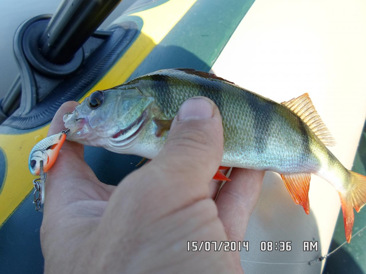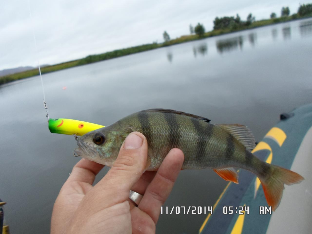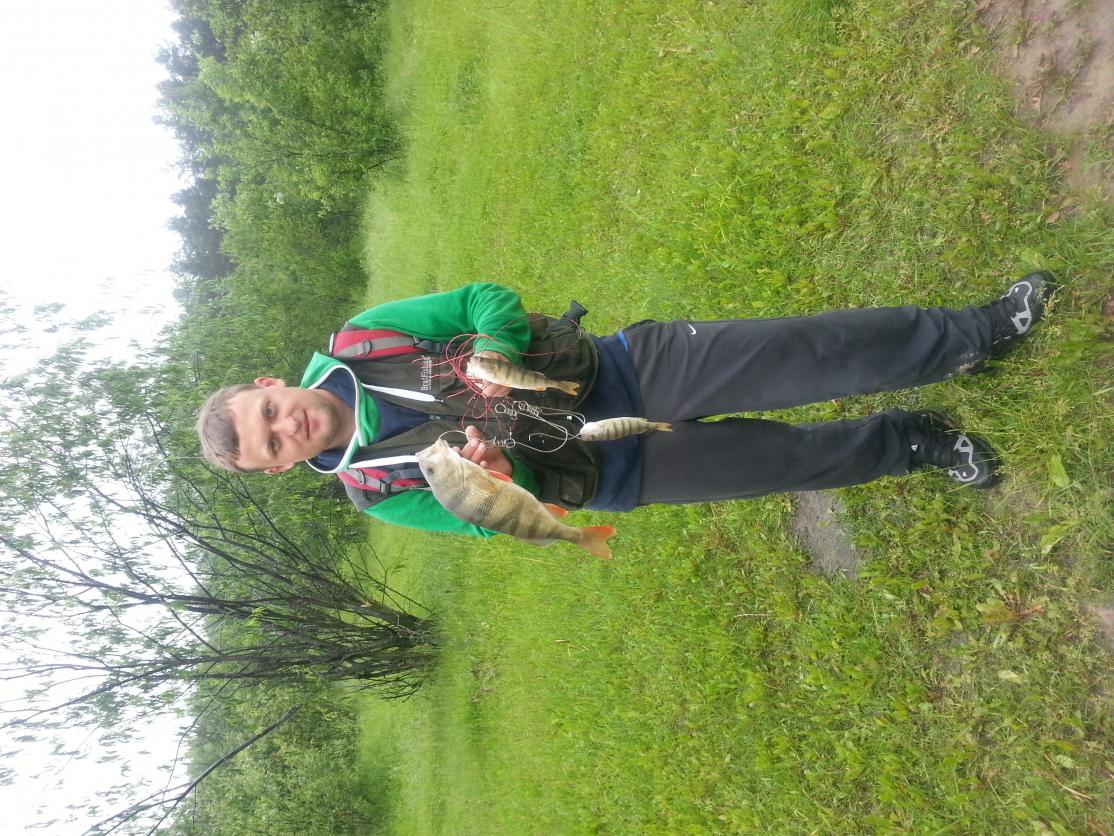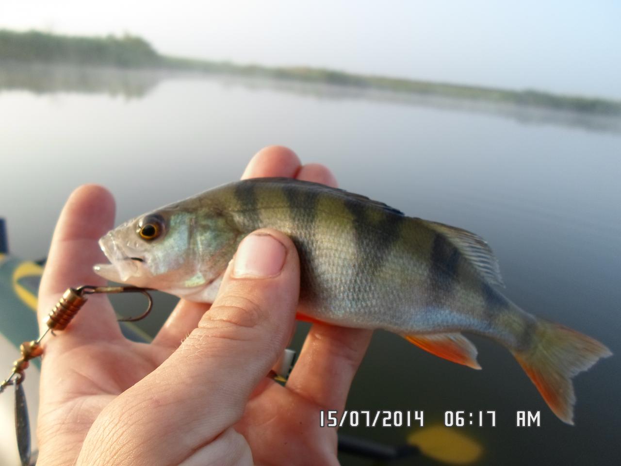 посетил сегодня один из водоемов.ловил на кружки и спин,но большый упор делал все же на кружки,и как оказалась зря..было всего 4 сработки,из них 1 сход(думаю очень даже дабротной щуки),1 окунь и 2 холостые,после которых остовались живцы превращенные в фарш... на спин довольно не плохо поклевывал окушок,попалась одна щука,но так как я больше времени уделял кружкам весь клев профукал,:( около 7:00 поднялся сильный ветер и ловить стало не комфортно и не удобно.. всего изловил 5 окуней и 1 щуку..