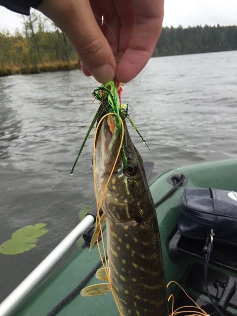 Начинаю перебирать стримеры, идёт проводка, поклёвка, подсечка, пусто, вторая, пусто. Стример атаковался на каждой проводке, но я так и не смог никого поймать. Меняю на более мелкий, на второй проводке, тук, сидит красавчик, ух, хорошо...