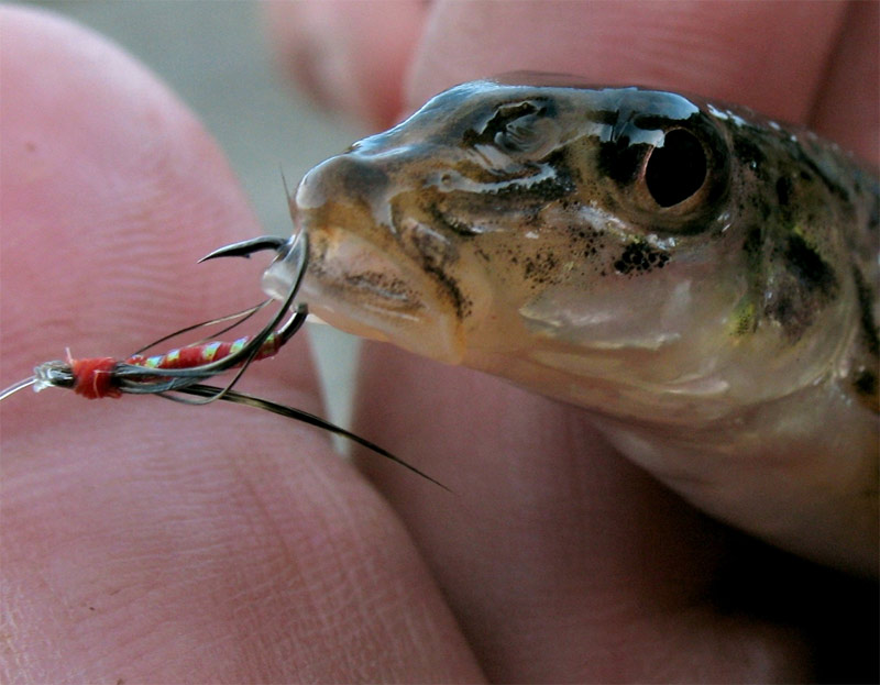 , у него с завидным постоянством ловилась плотва, уклейка, окунь, и даже поймал пескаря, перерыв коробку, у меня такого цвета мушки не нашлось.