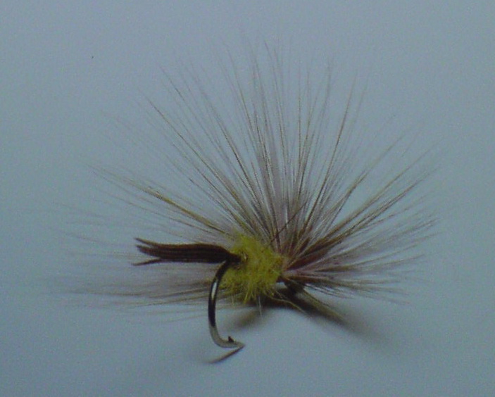 Здесь мушка, относящаяся к типу No Hackle. Автора не знаю, но показал ее мне Адам Сикора. Мушка вяжется довольно просто и имитирует в больших размерах слепня, овода, а в малых - родных "комнатных":) мух. Ловил на нее вредных ельцов, ну и всех остальных, питающихся поверху рыб.