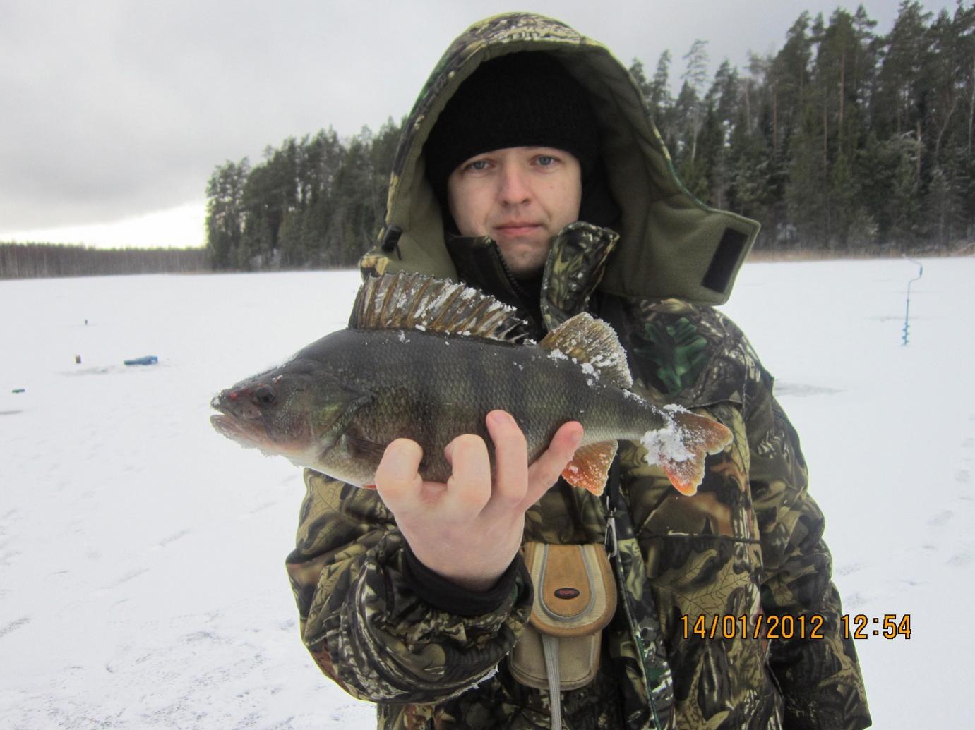 Друзья мои товарищи остаются ловить белую рыбу на прикормленных лунках, а я, схватив удочку с блесной, пошел по просторам искать трофейного полосатого, а его в этом озере хватает. В основном и приезжают сюда за ним. Но клевал лишь не крупный полосатик, но в надежде на хорошую поклевку, я все сверлил и сверлил лунки благо толщина льда позволяла делать это без всякого напряжения. Ближе к обеду, издалека видим, что горит флажок. До цели метров двести, но идем не торопясь. Подойдя поближе, видим, что горят еще два. Еще немного ждем, размотка небольшая есть, но уже не мотает. Друг аккуратно выбирает леску, я снимаю сие действие на камеру, но ….. пусто. Живец побит, но без порезов, явно окунь. Проверяем остальные сработки – та же картина. Ну да ладно, еще вечер впереди. Меняем живца, небольшой перекус, и опять по лункам. Часам к четырем поднадоело ловить мотросню, выдвинулся к своим боевым товарищам, периодически буря по пути лунки. И, О чудо! На небольшой паузе уверенная поклевка в руку и красавец полосатый на льду.