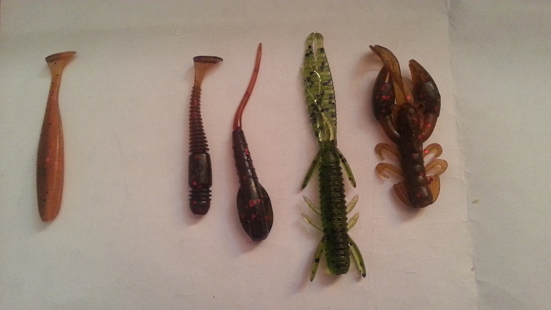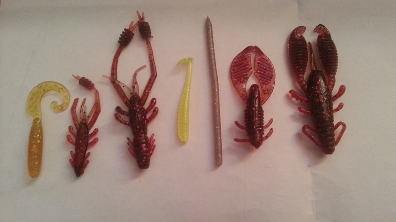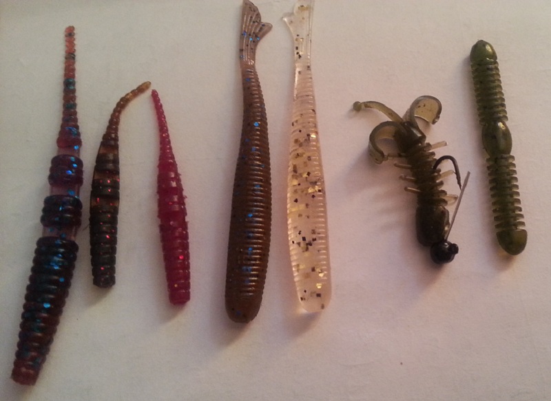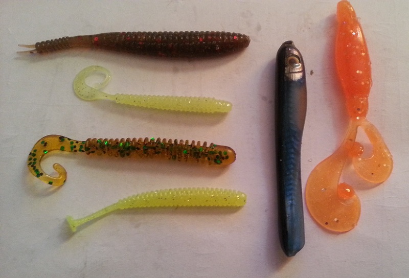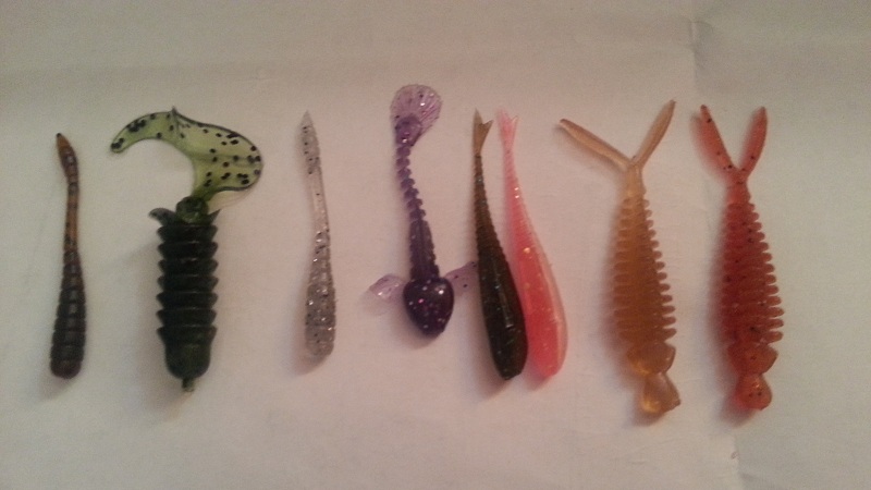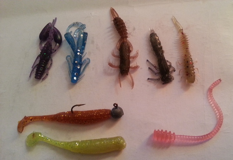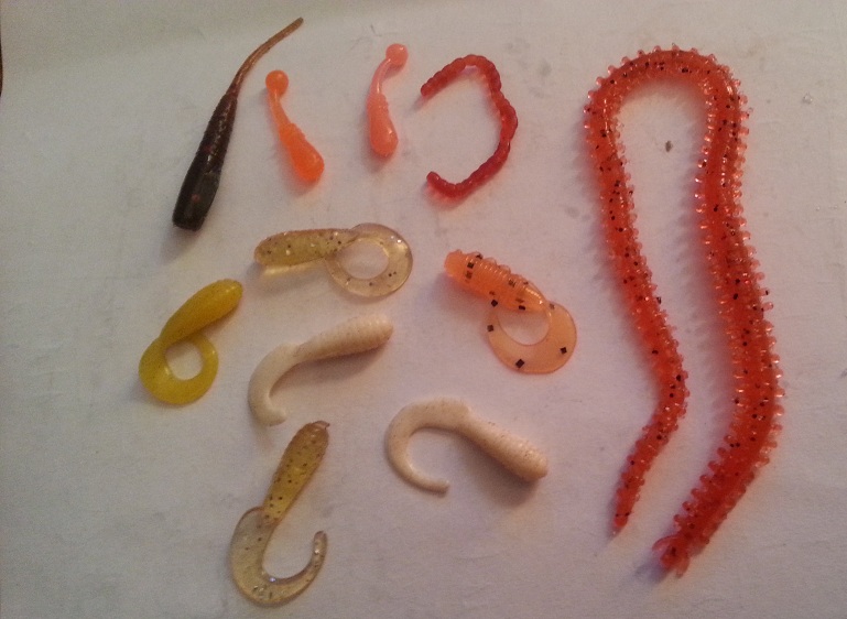 Lucky John Troutino 1.6, Crazy Fish WhiteBait, Kosadaka Sota Worm (мотыль), россыпь мелких твистеров несъедобных купленых в незапамятные времена, пародия на Marakui от Aiko (ловит). Bait Breath Microgrub очень клевый мелкий твистер. С горем пополам налазит на Small Inch Hook (офсет) даже. И начинает драконить мелочь.
