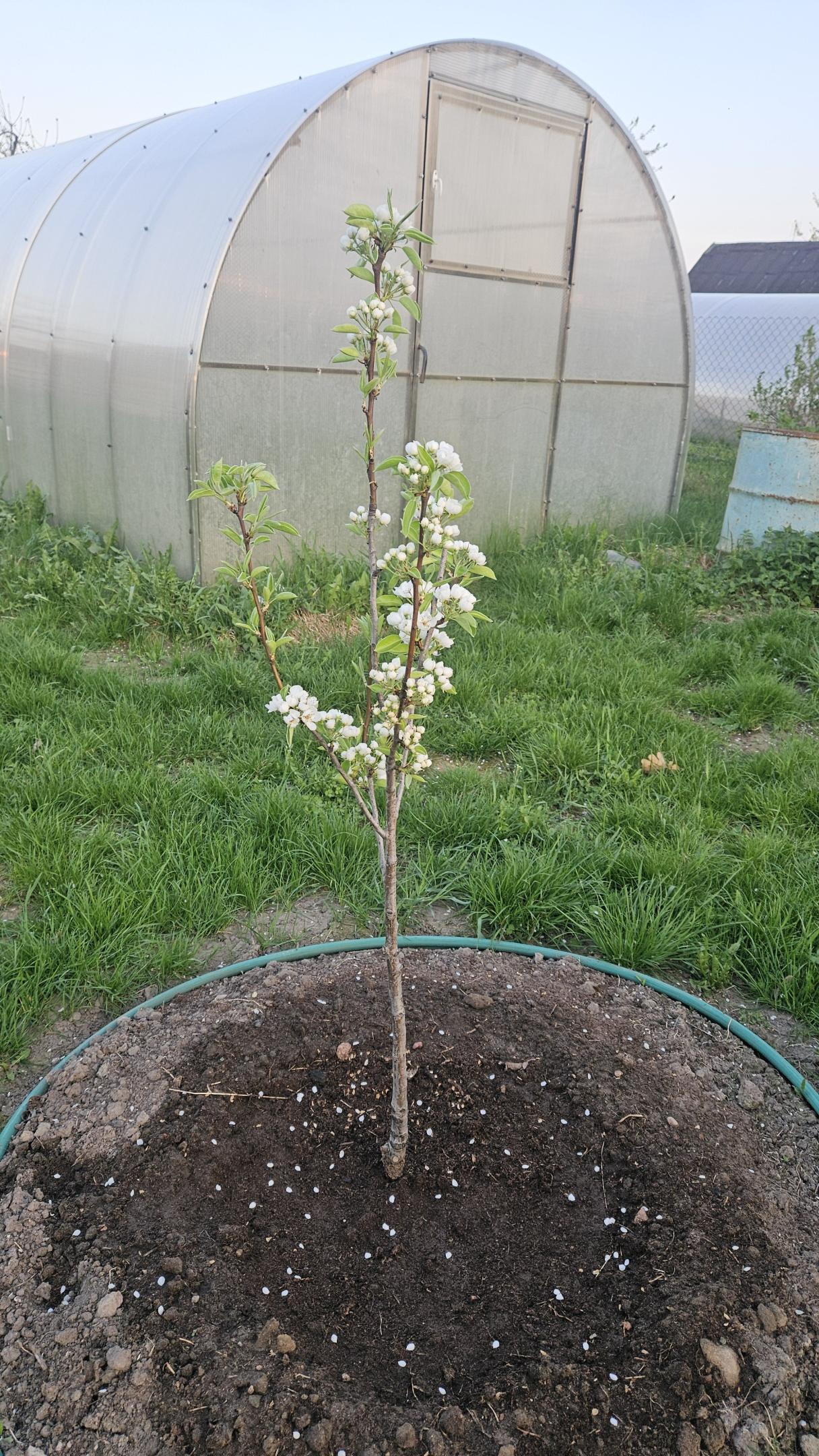 • За эту грушу я бы вообще не переживал, рано ей еще плодоносить, даже если что-то и завяжется - лучше завязи пообрывать. Иначе много ресурсов уйдет в плоды, которые врядли будут полноценными. Эти ресурсы лучше направить в развитие кроны. Потом это с лихвой окупится.
