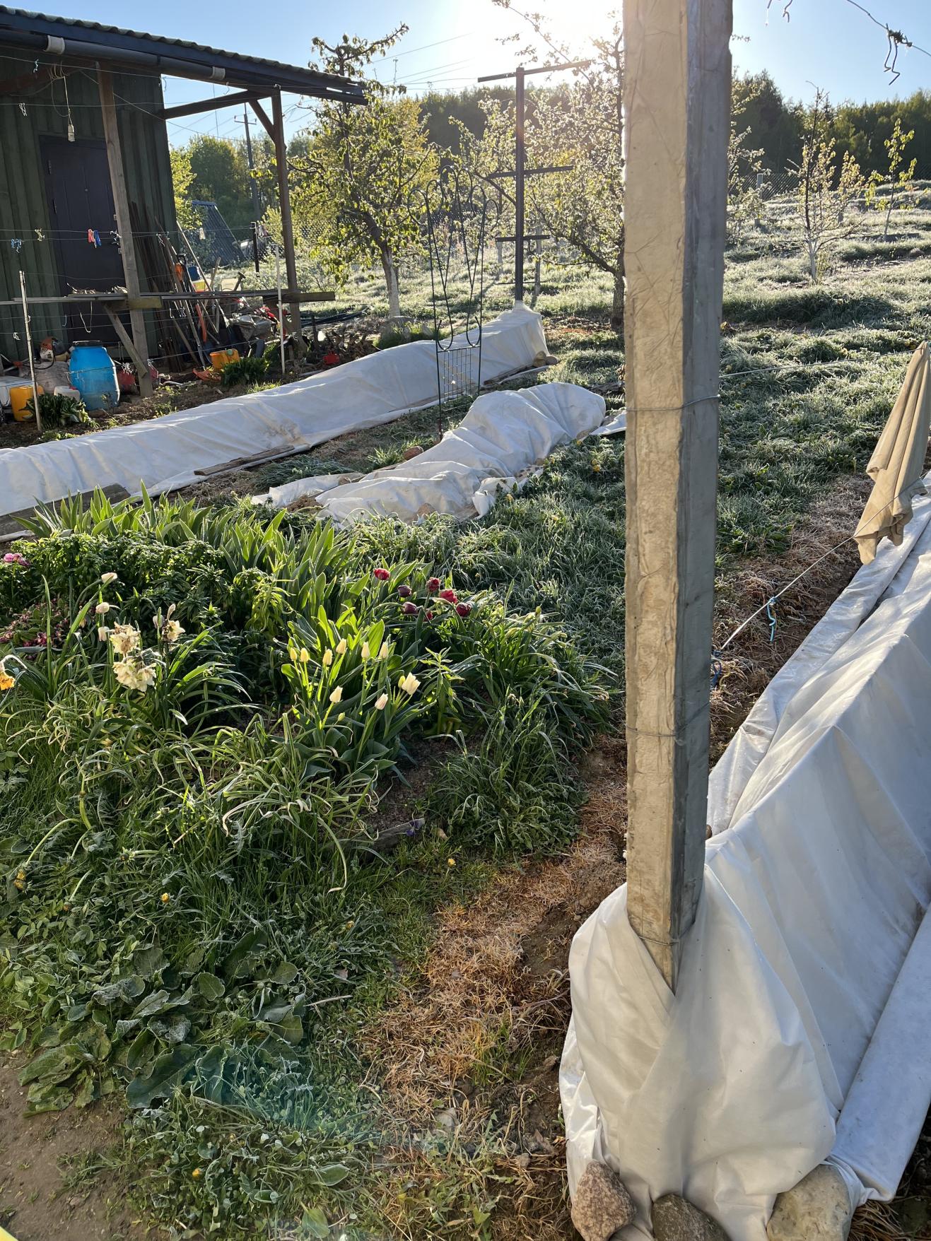 Через проволоку шпалеры закинут спадбонд двойной, 60 плотности, на зиму так накрываю, сразу снял в апреле, потом перед заморозками закинул снова, и не снимал, такими темпами придется до лета походу держать под укрытием виноград