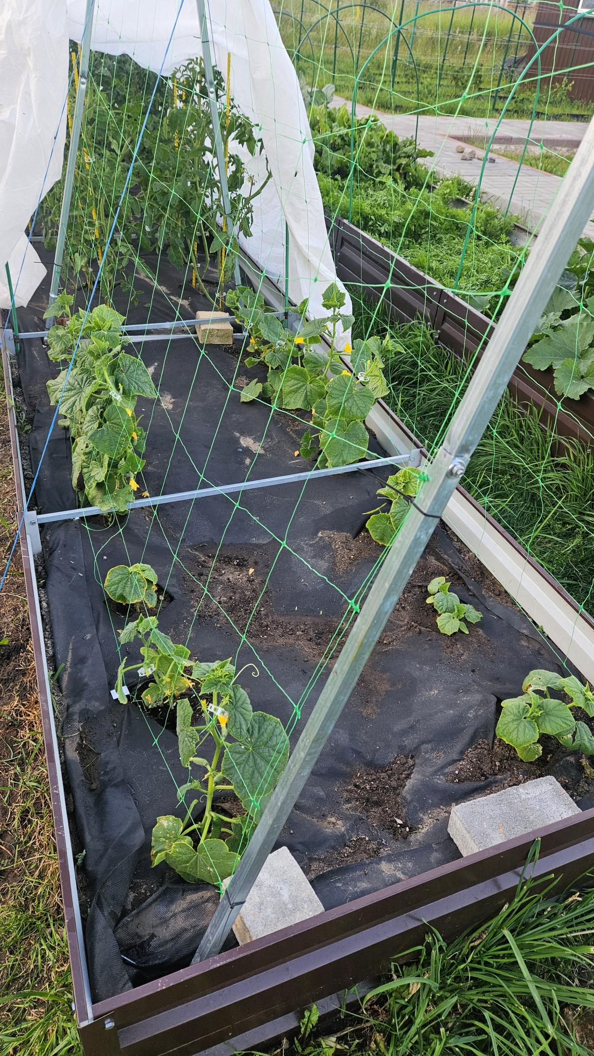 Ну, и огурчики открытого грунта на высокой грядке пошли. Сладкие.