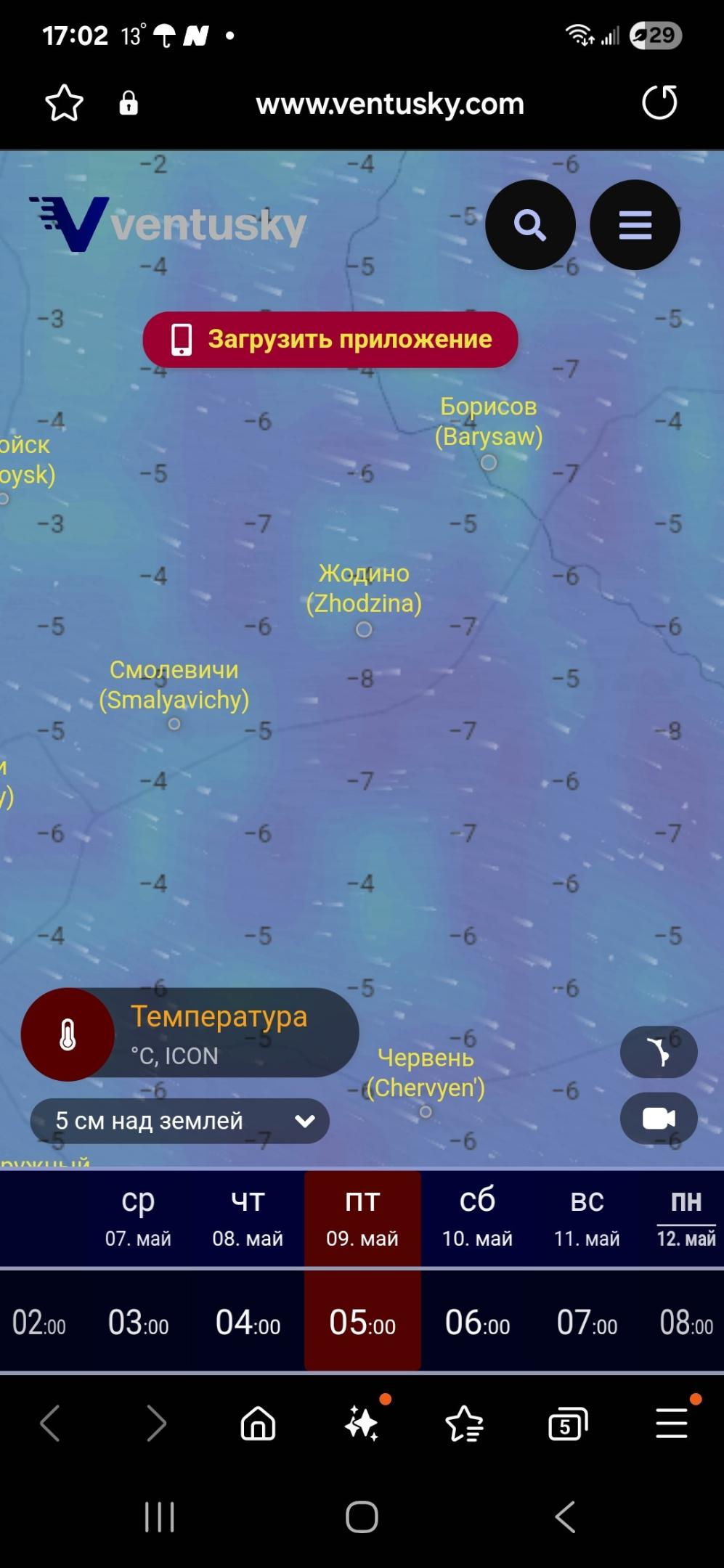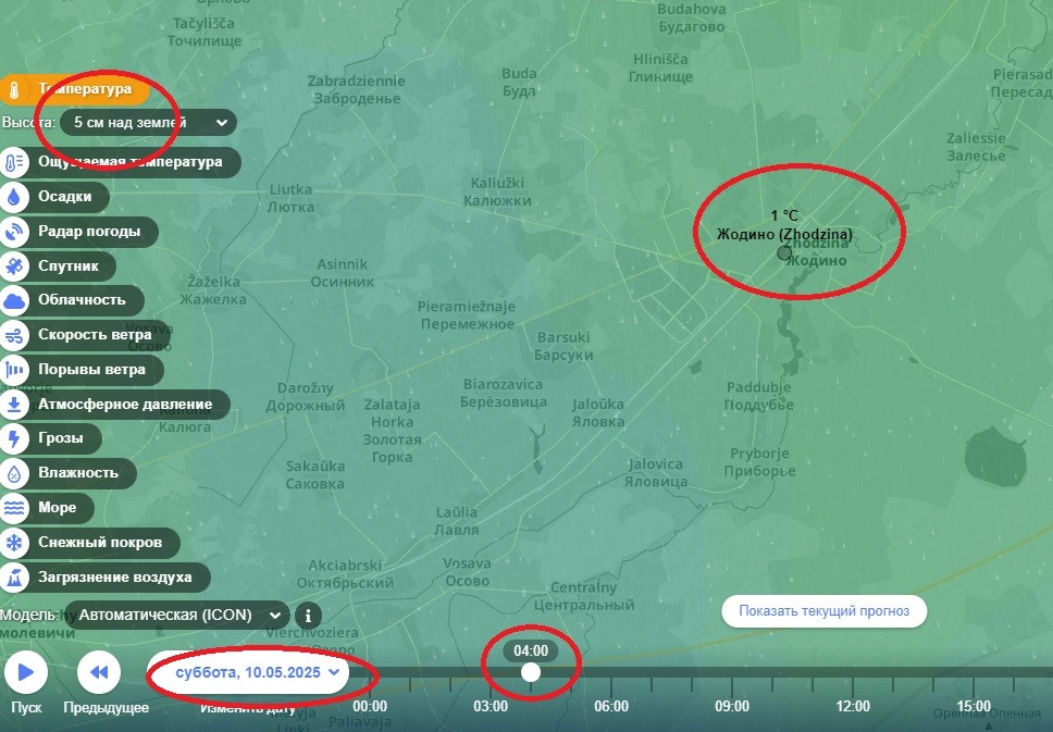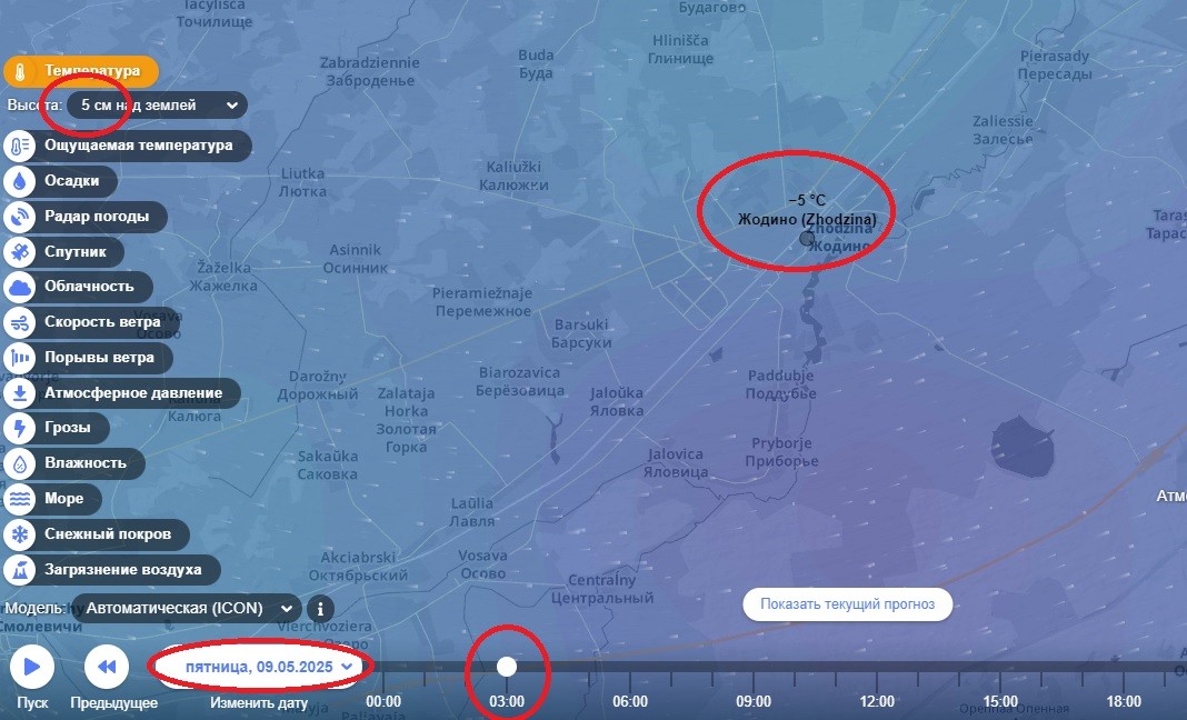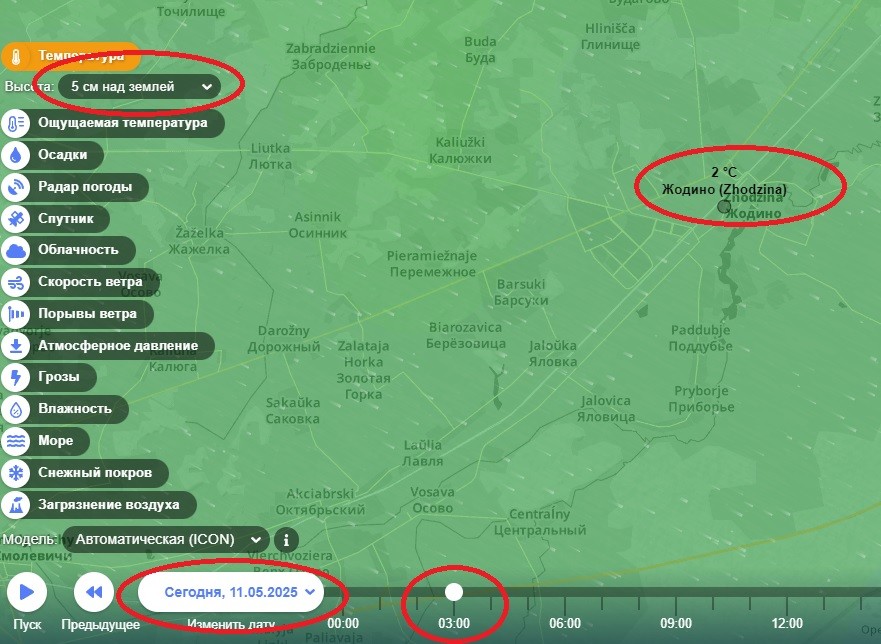 Ехал на работу , разбираться времени не было. :) И я как то не привык мерить 5 см над землёй. Из курса метеорологии помню что есть сильно большая разница в промерзании открытых пространств с голой землёй , и с поросшими растительностью а то и лесом . Сам когда еду смотрю на градусник в машине , в ночи с опускающимся морозом бывают перепады до десятка градусов на считанных километрах между низинами , участками под лесом , открытыми , и холмами . Особенно на холмистой местности между Логойском и Ильёй это в глаза бросалось по пути на ВВ. Бывало что выезжал из дома в -17, а там удавалось словить на панели приборов в машине -39. Но это точечно , локально .