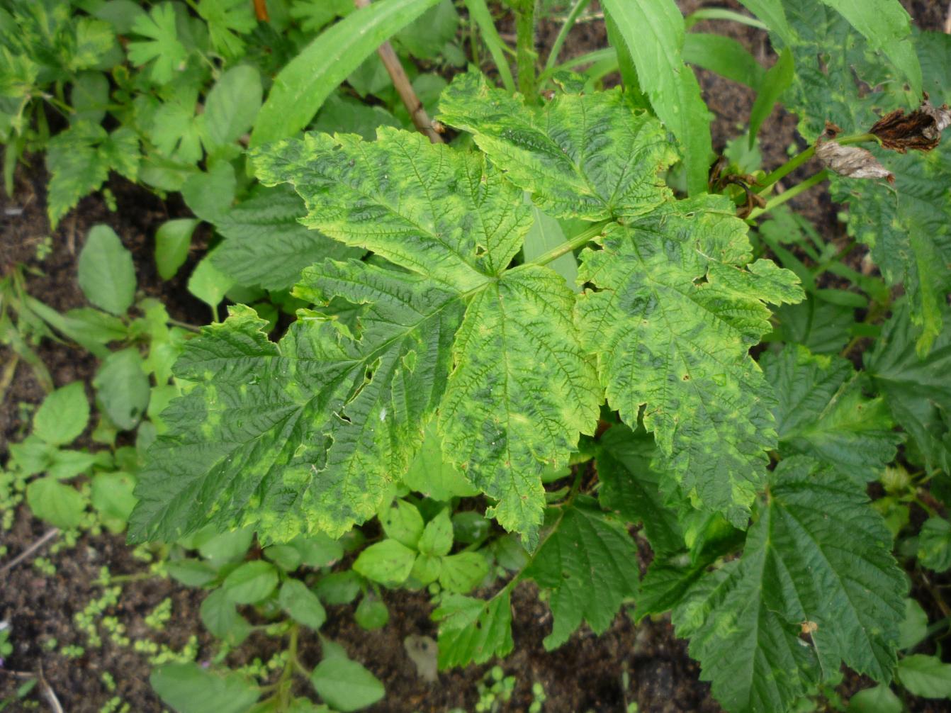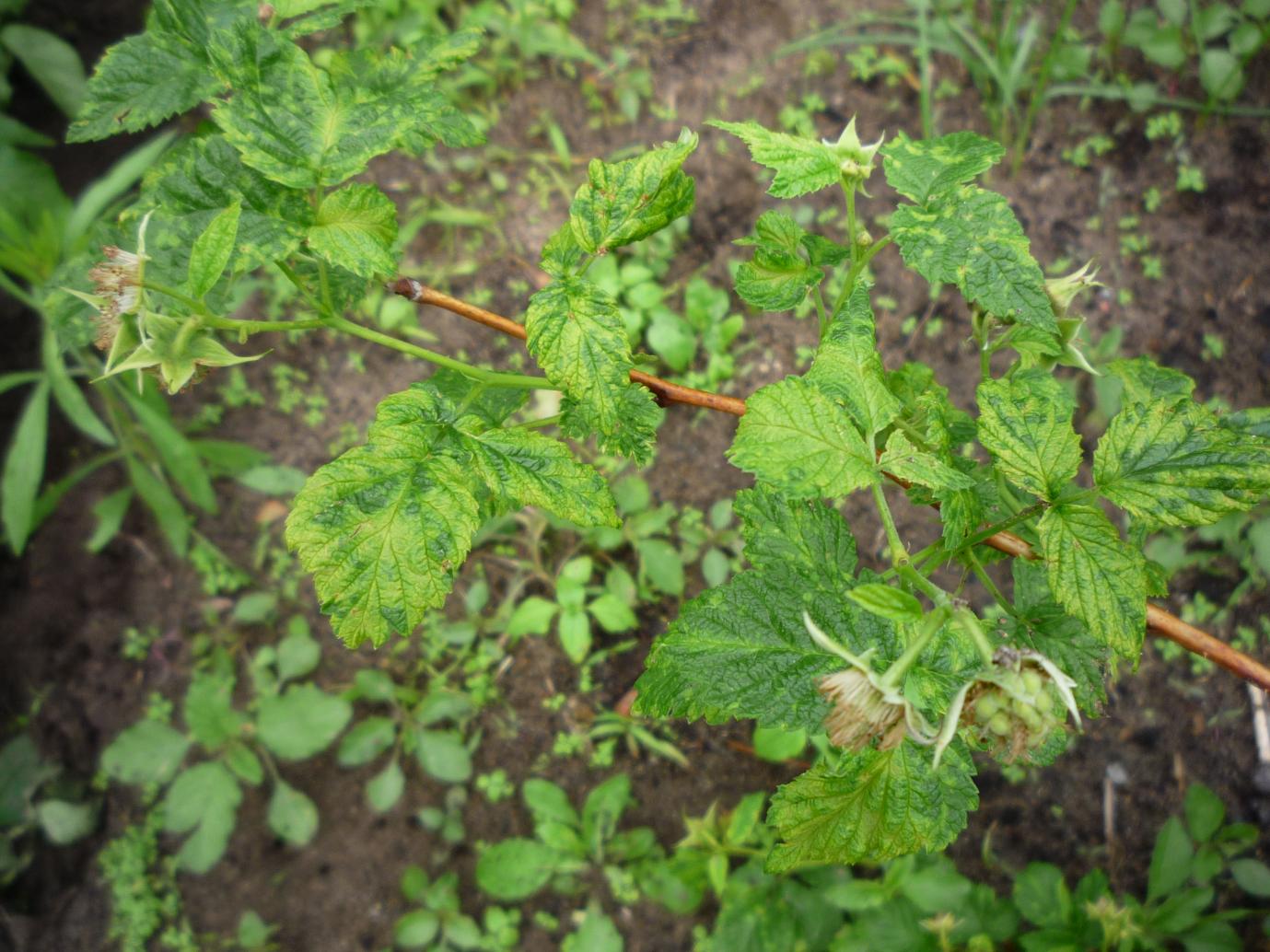 В прошлом году привез от тещи на дачу кусты малины, по осени пересадил. Перезимовали нормально, пустили новые отростки, и вот неделю назад на листьях появились желтоватые пятна, а кой - где и дырочки. Обидно и досадно.:( Подскажите, что это за напасть и как от неё избавиться. :o