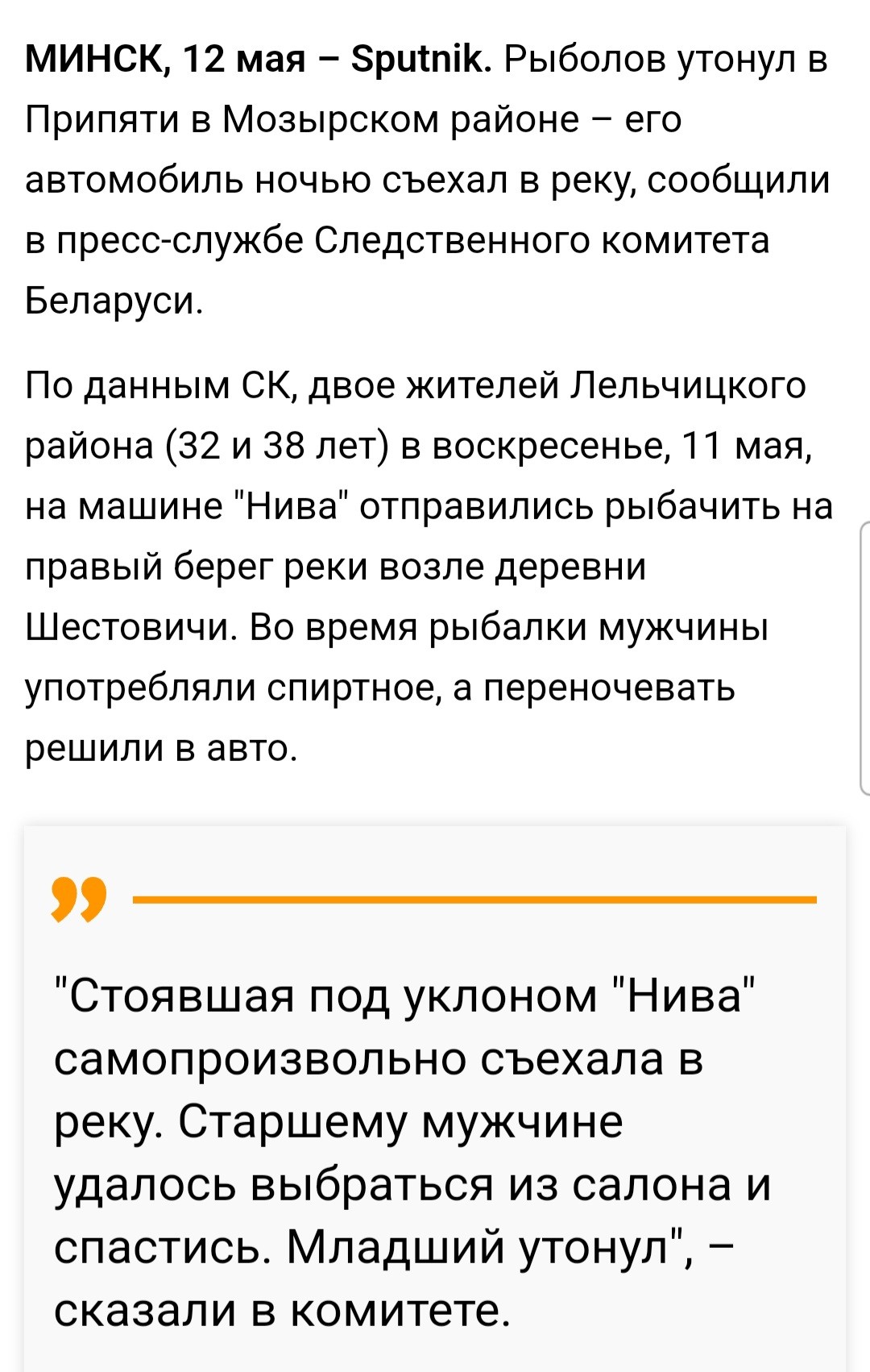 Агентство Спутник сообщает, что во время рыбалки машина сьехала в реку и утонул рыбак, второму удалось спастись.
