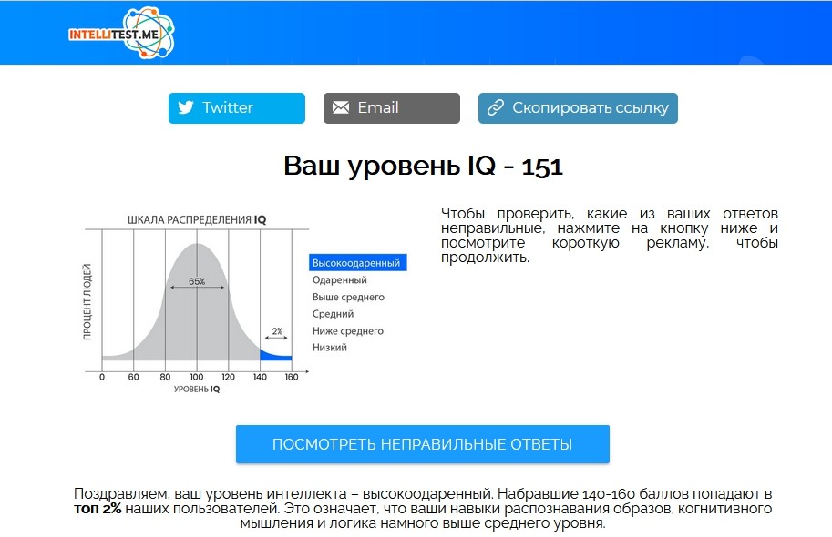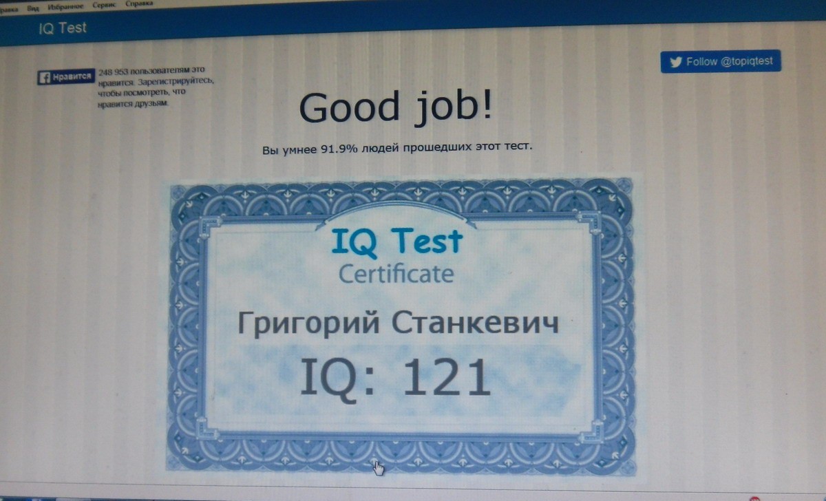 Ладно, раз сама напросилась, то отчитаюсь. Ваша ссылка у меня не работает, на первый вопрос отвечаю, показывает 3% и дальше никакого движения. Но я погуглила и обнаружила там уйму вариантов этого теста. Выбрала какой-то бесплатный, без регистрации, на 40 вопросов и приступила. Отвечала добросовестно на вопросы где-то до 25-го, а потом мне стало скучно, нудно и меня начало мучить, какого хрена я так непродуктивно трачу время на то, что мне совершенно не интересно?!! Эти дурацкие головоломки из букв, фигур и цифр никаким образом интеллект не характеризуют, кретинизм какой-то, впрочем, как и всё американское. И потом в моём варианте теста не накладывались временные ограничения, а это совершенно некорректно. Над некоторыми ответами я думала 1 минуту, а над некоторыми 10 и больше, перебирая всевозможные варианты. Чёрте шо. В конце я уже устала, начала халтурить, ляпала абы шо, просто чтобы посмотреть, как же будет выглядеть конечный результат. Получилось, что правильно ответила на 20 вопросов, 2 вопроса вообще послала нахер и результат мой 115 баллов или очков, как там у них называется, не помню. И вернулась к поиску своих любимых картинок, чтобы успокоить нервную систему. Буквально минут через 10 нашлась великолепная картинка, которую составителям теста можно порекомендовать включить в свой опросник: