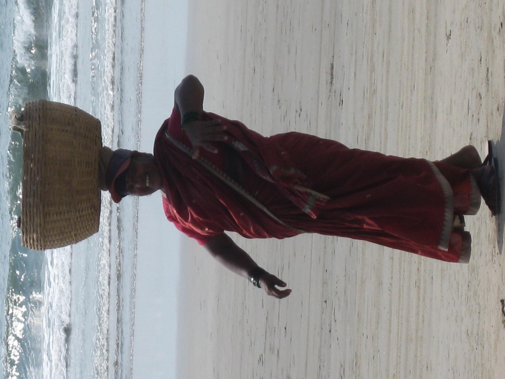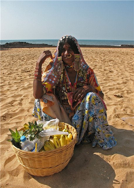 От самих индусов. Многие из них как маленькие дети. Парочки ходят держась за руки, в воду что мужчины, что женщины заходят по колено и в одежде, по-детски радуясь волнам. Вообще, они очень приветливые и доброжелательные люди. Одна из тропинок на пляж проходила буквально в метре от крыльца дома, который не был огорожен никаким забором. И каждый раз, когда мы проходили мимо хозяева, а у них обычно двери открыты, видя проходящих туристов, приветливо улыбались и говорили "Привет!". У нас бы уже давно поставили забор, капкан и посадили злющую собаку на цепь. А слово "привет" у их вообще знают все, наверное, с рождения. И обращаются они с этим русским "приветом" ко всем без разбору. Сам задумывался, как относятся к такому "приветствованию" англичане, которых там не меньше, чем русских. Русский у них учат все. Во многих даже самых мелких лавках торговцы с гордостью показывали мне самоучители русского языка и попутно спрашивали как сказать то или иное слово по-русски. По дороге на пляж тебя 20 раз встретят фразой: "Привет! Как дела? Посмотри мой магазин!". И это не тупо заученные фразы. Они поймут, если ответишь. А если промолчишь, то сами скажут: "Заффтра?" или "Потом?", а на твой утвердительный кивок добавят: "Потом - суп с котом!". Еще удивило то, что при всей нищете, пыли, сильной жаре и влажности практически не могу вспомнить грязно, неопрятно одетых индусов. Если в рубашке, то обязательно белая или светло-голубая и как будто только постиранная и отутюженная. Если в сари, то как будто только из магазина. Даже торговки на пляже, тягающие огромные корзины с фруктами или большие тюки с разными тряпками/бусами, одеты как куклы.