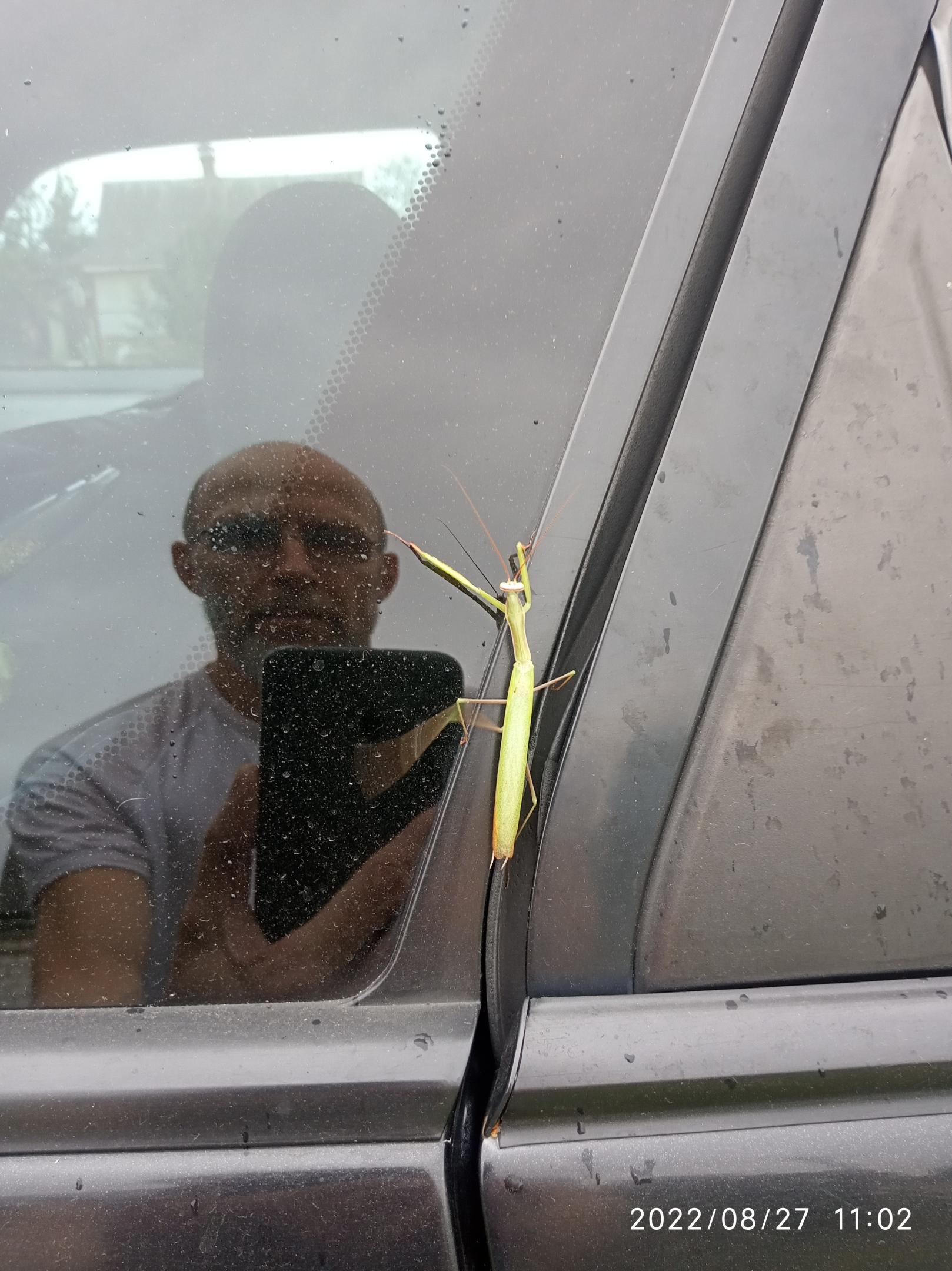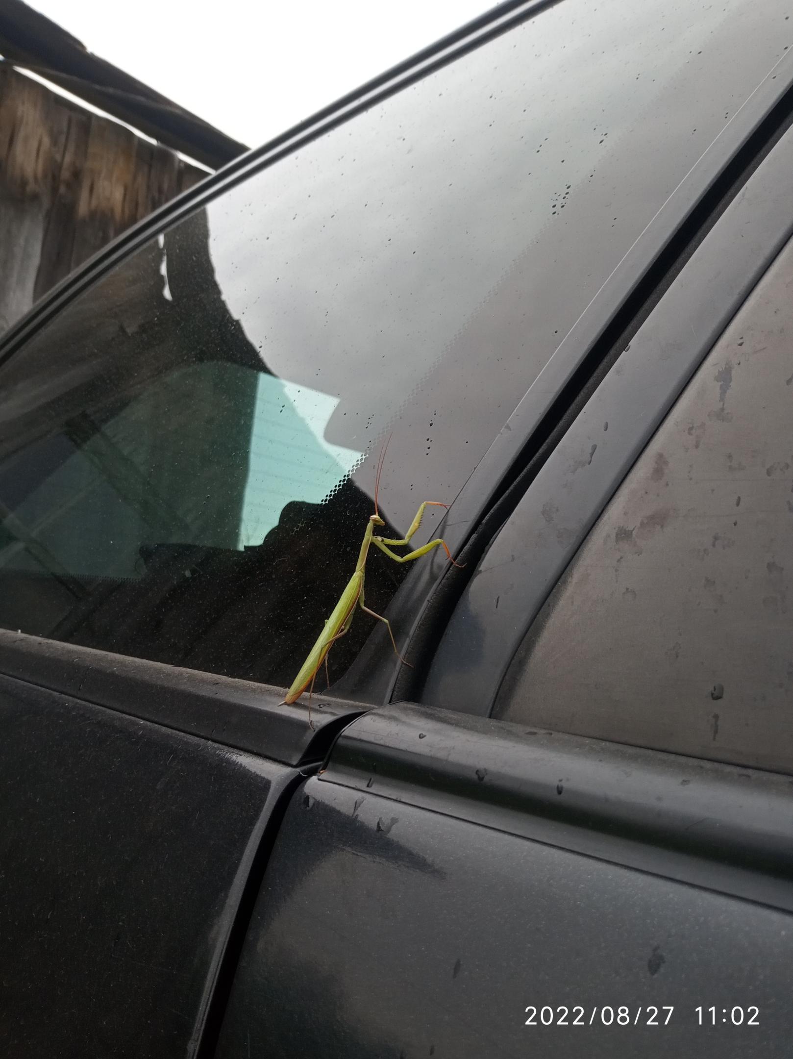 В эти же, прошедшие то-есть выходные, богомол ко мне прилетел, сел на машину, и гре́ется.