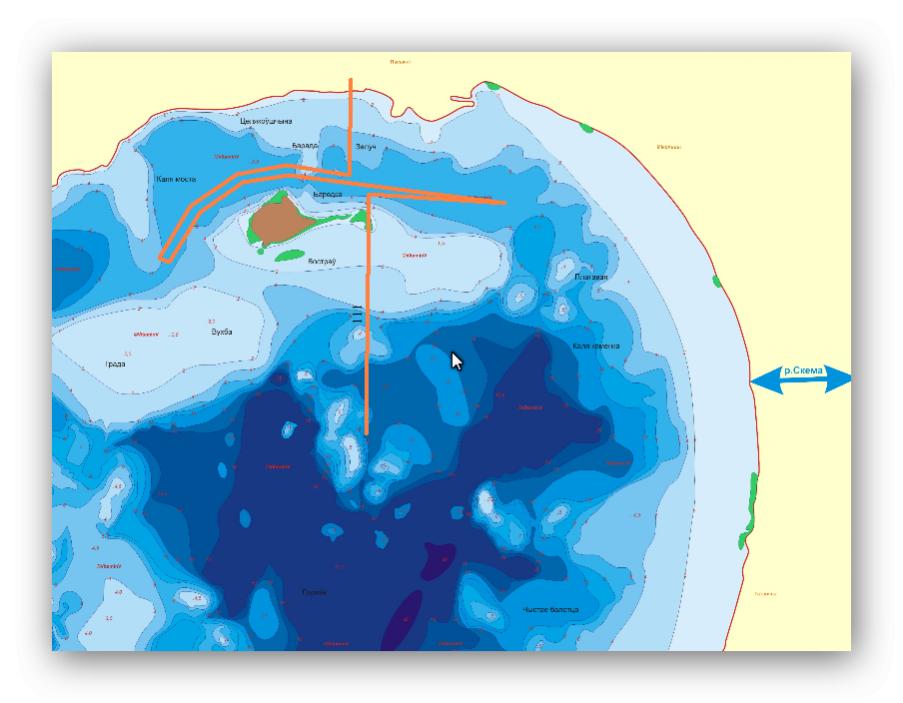 Если лед будет толще 10-15см, и у вас есть навигатор с картой, то можно пройтись на юг к бугоркам, 1,1 - 1,5км от восточного края тростниковой гряды, см. картинку.