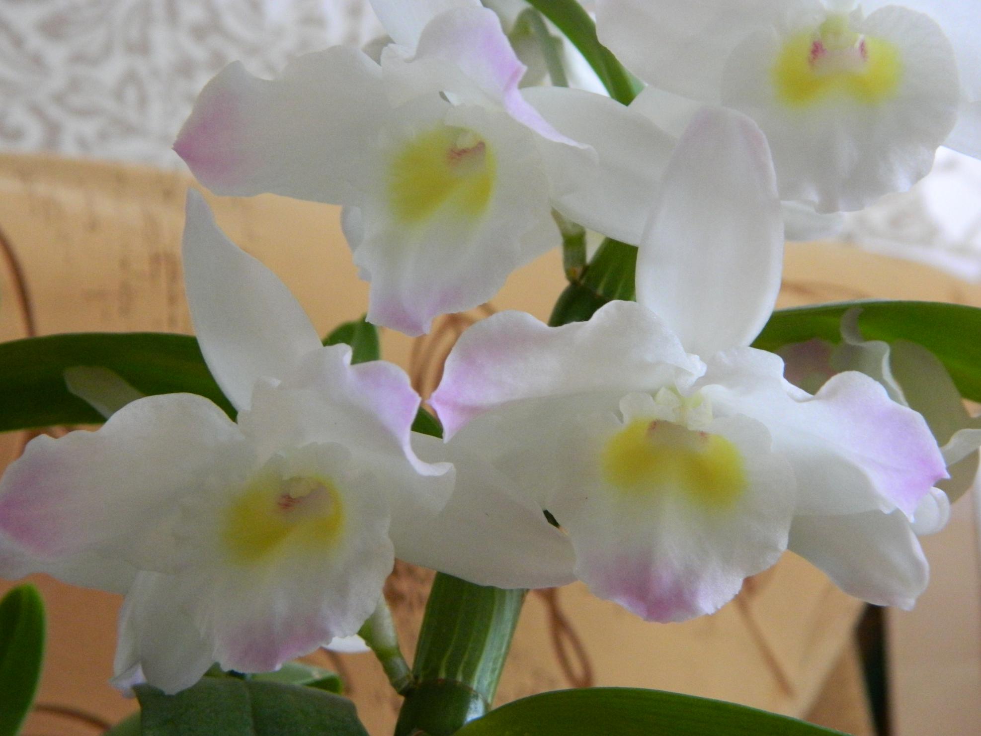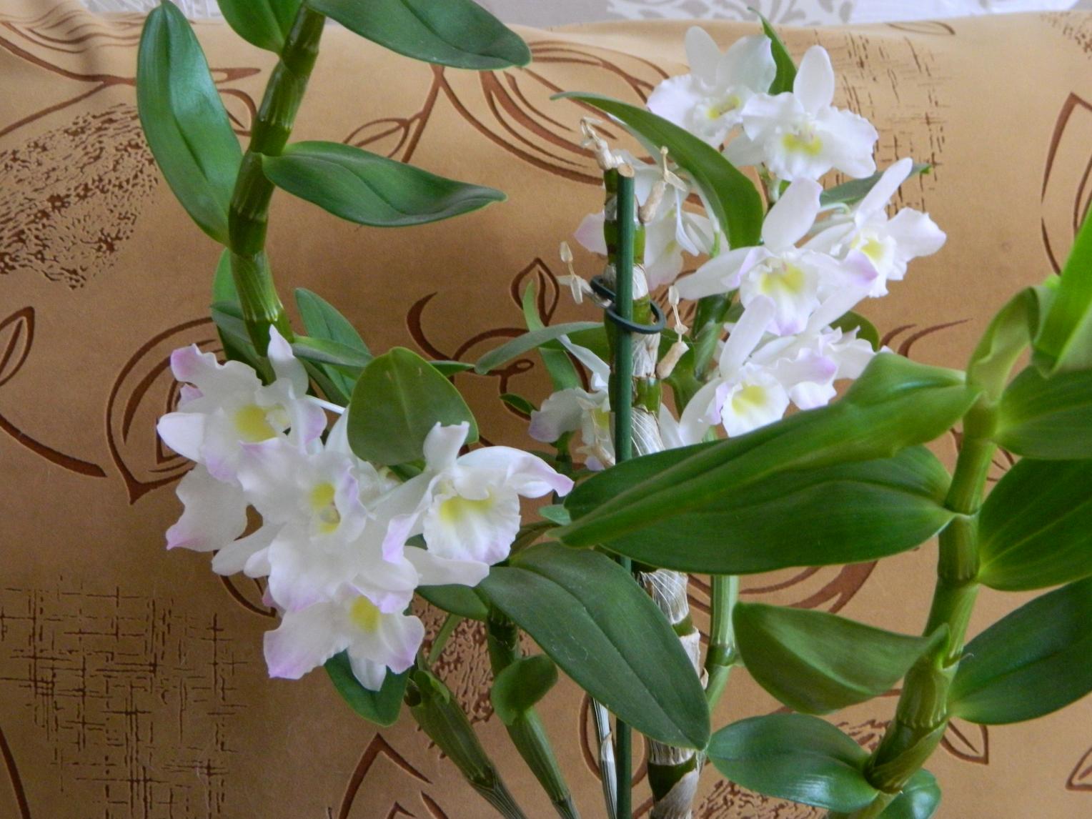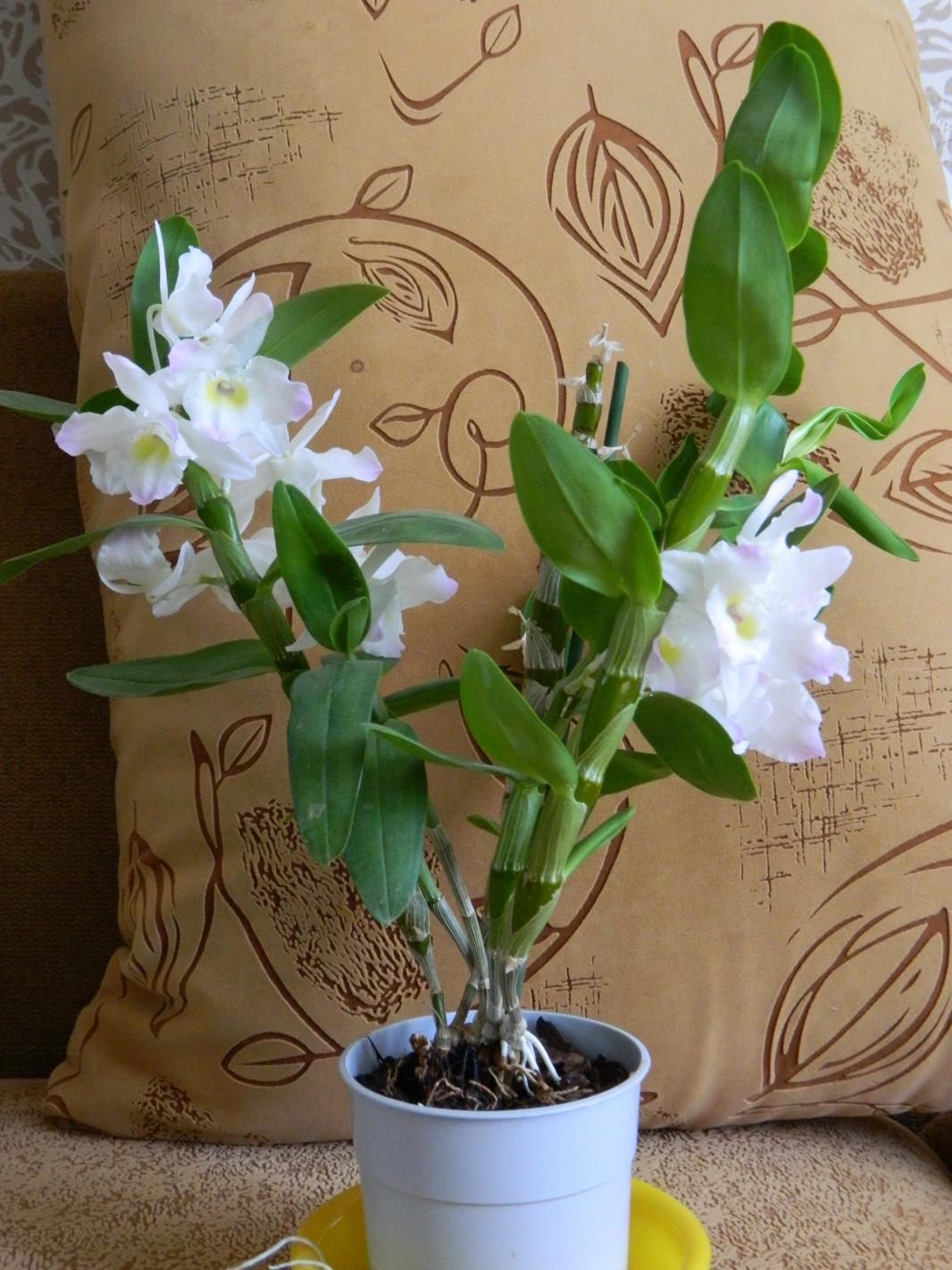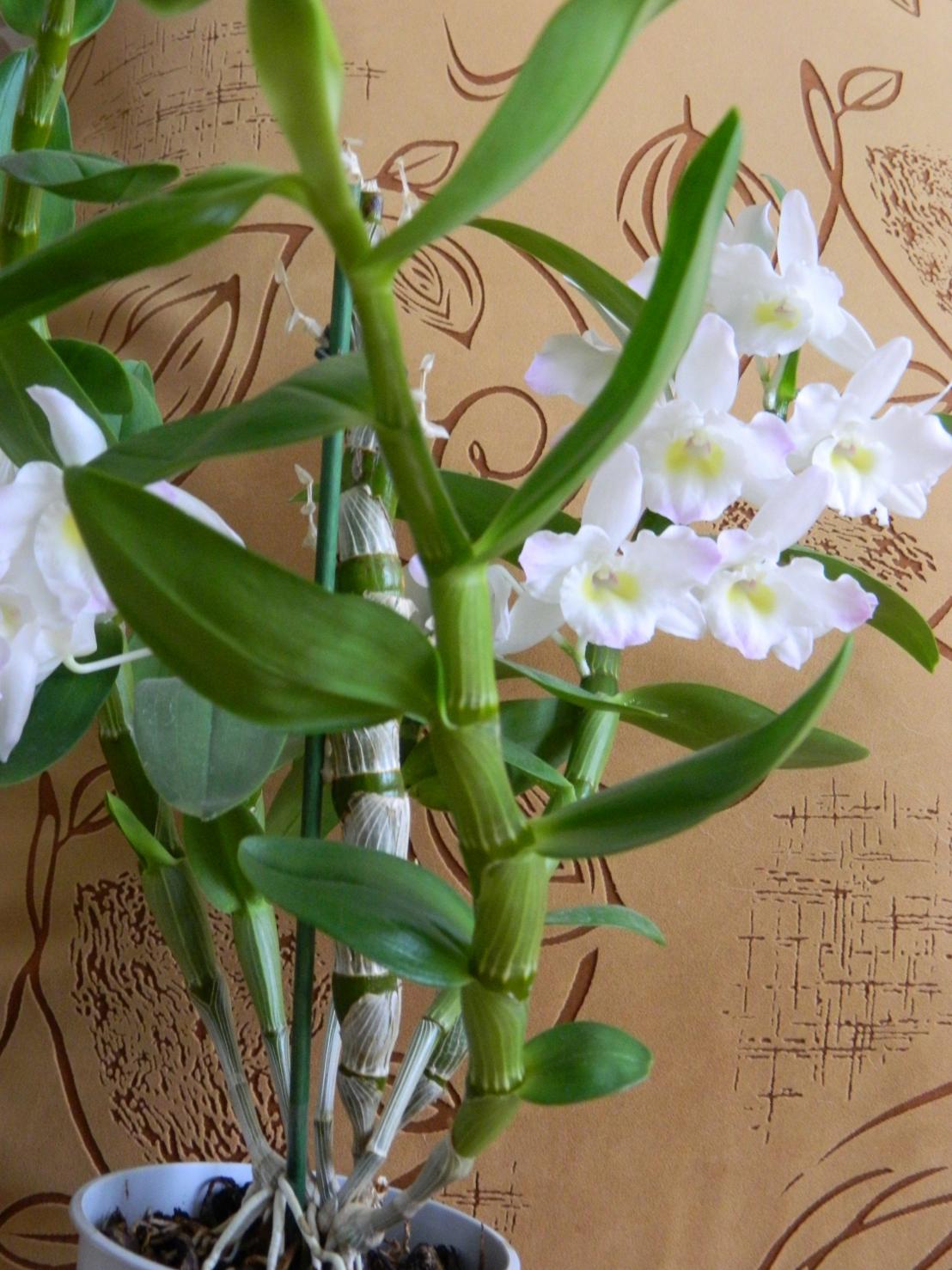 • Дендробиум нобиле. Получается, что в домашних условиях он цветёт на побегах прошлого года. На фото 4 на переднем плане побег этого года.Нажмите на изображение для увеличения.