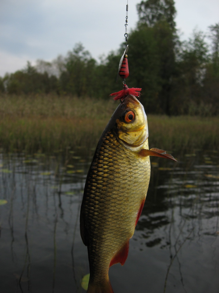 вторая на том же месте чуть чуть недогнала приманку, но зрелище было еще то...заброс, бурун (выход), малек аж не берег выскакивал пока она за блесной шла:o но...:( У Митрея один сход под кило... примета сработала только на нем:D. У остальных рыбачков тоже все было очень печально. Походу в те дни (судя по другим отчетам щукарей) она тупо нехотела хавать. Попробовав половить мелочь для кружков, поймал неплохую плотвину, пару окуней и несколько красноперин. Но кружки несработали. В обед решили кинуть это дело и поехать в грибалку.