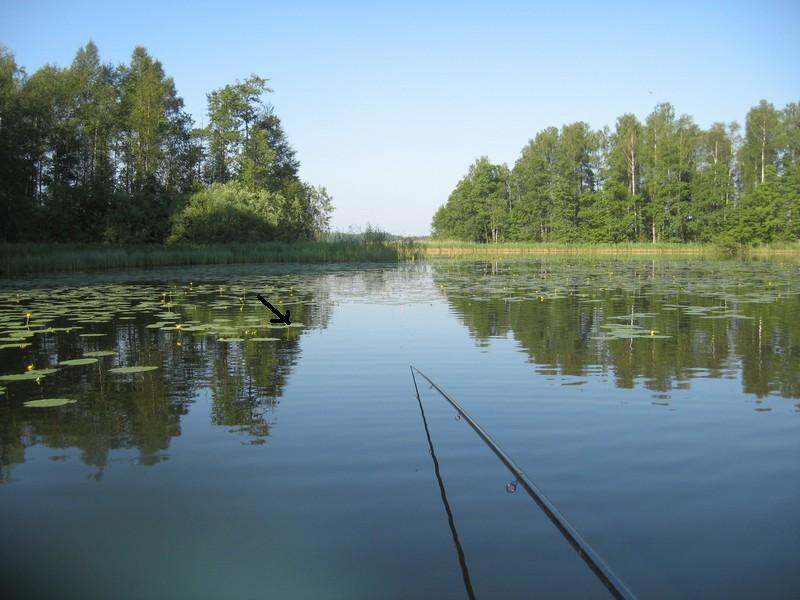 попробую хоть краснопёрку поймать. Поклёвка, подсечка, тяну. Линёк или краснопёрка??? Хороший подлещик, за ним ещё один. За первый час поймал 7 штук, не считая хорошей плотвы, мелочёвки там вообще нет. Интересно, что подлещик брался в этой заводи на глубине 70-80 см. А особенно в 20 см. от одной кувшинки, на фото место отмечено стрелочкой. Думал, что там небольшой перепад глубин – нет. Гнездо там у него было что ли? Был бы у меня эхолот, в жизни бы там не стал, бороздил бы просторы в поисках. Краснопёрка так и не отметилась. Привязалась ко мне бабочка, всё пыталась из меня что-то высосать своим жёлтым хоботочком.