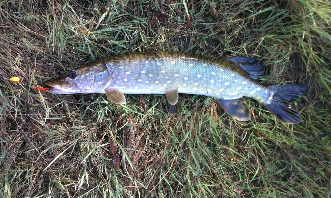 • Походил сегодня по речке в районе моста на объездной.Нашёл мелководье со стелящейся по течению травой.Первая щучка взяла на капыто3,потом стал гонять Ватер мокасин,на него два шнура.Перешёл немного ниже,глубина около двух метров,воблер Страйк про,твич,один шнурок грамм 400(ушёл домой) второй под кило(порвал жабры,пришлось забрать ).Ловил с высокого берега вприглядку,видел как щука берёт воблер на паузе...зрелще Суперрр!!!Немного фоток.