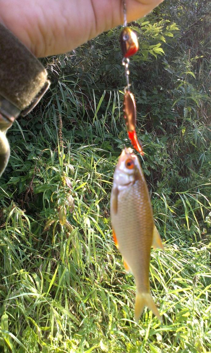 • В субботу с утра пробовал ловить на Двине, оставив на дне с пяток виброхвостов и ничего не словив, решил пробежаться по Лучесе. Воды в речке - по колено, поэтому ловил на вертушку. Голавлики совсем мелкие. На всем протяжении смог найти только один приямок толковый, откуда и удалось достать щучку на 800 грамм. Помимо этого плоточка, каким-то чудом, умудрилась носом сесть на крючок.