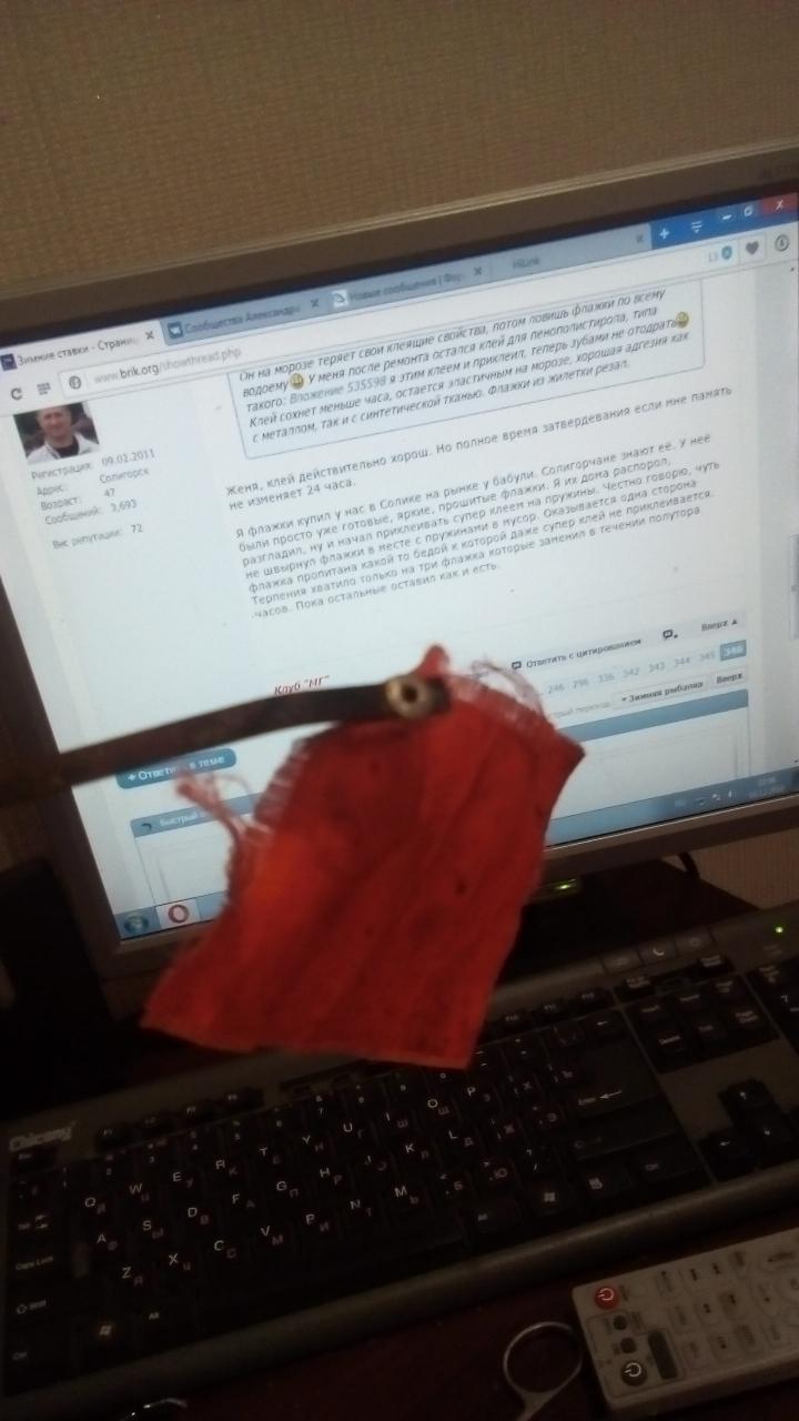 • По поводу флажков: В цуме, в отделе "Ткани" есть подкладочная ткань, ее продают разной шириной. Края можно как зажигалкой обработать так и оверлочить на швейной машинке. На металл закрепляю горячим клеем с помощью термопистолета. Еще видел яркие ткани со светоотражателем (как фликер), удобно для тех, кто рыбачит ночью, посветил фонарем и увидел горит или нет.