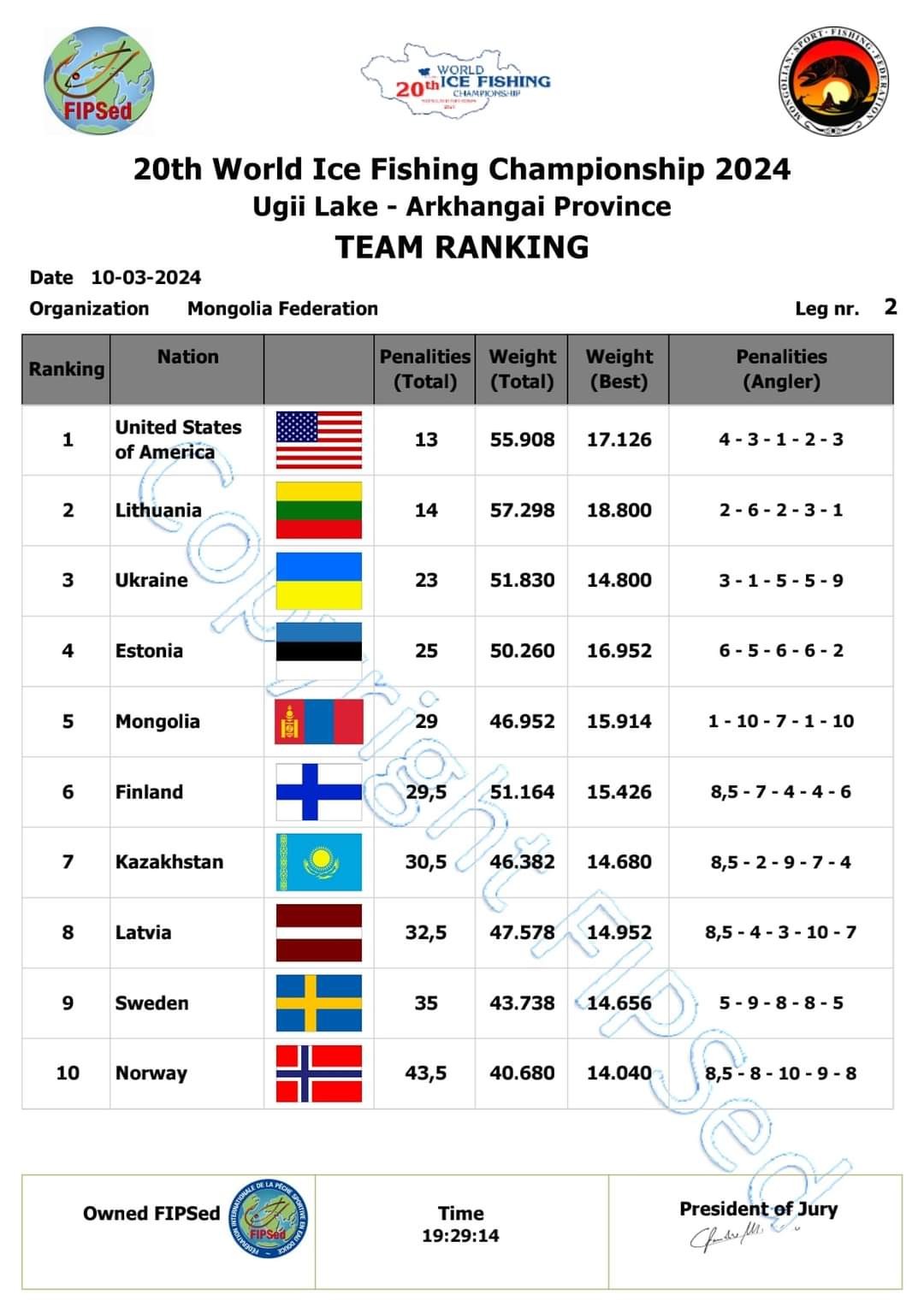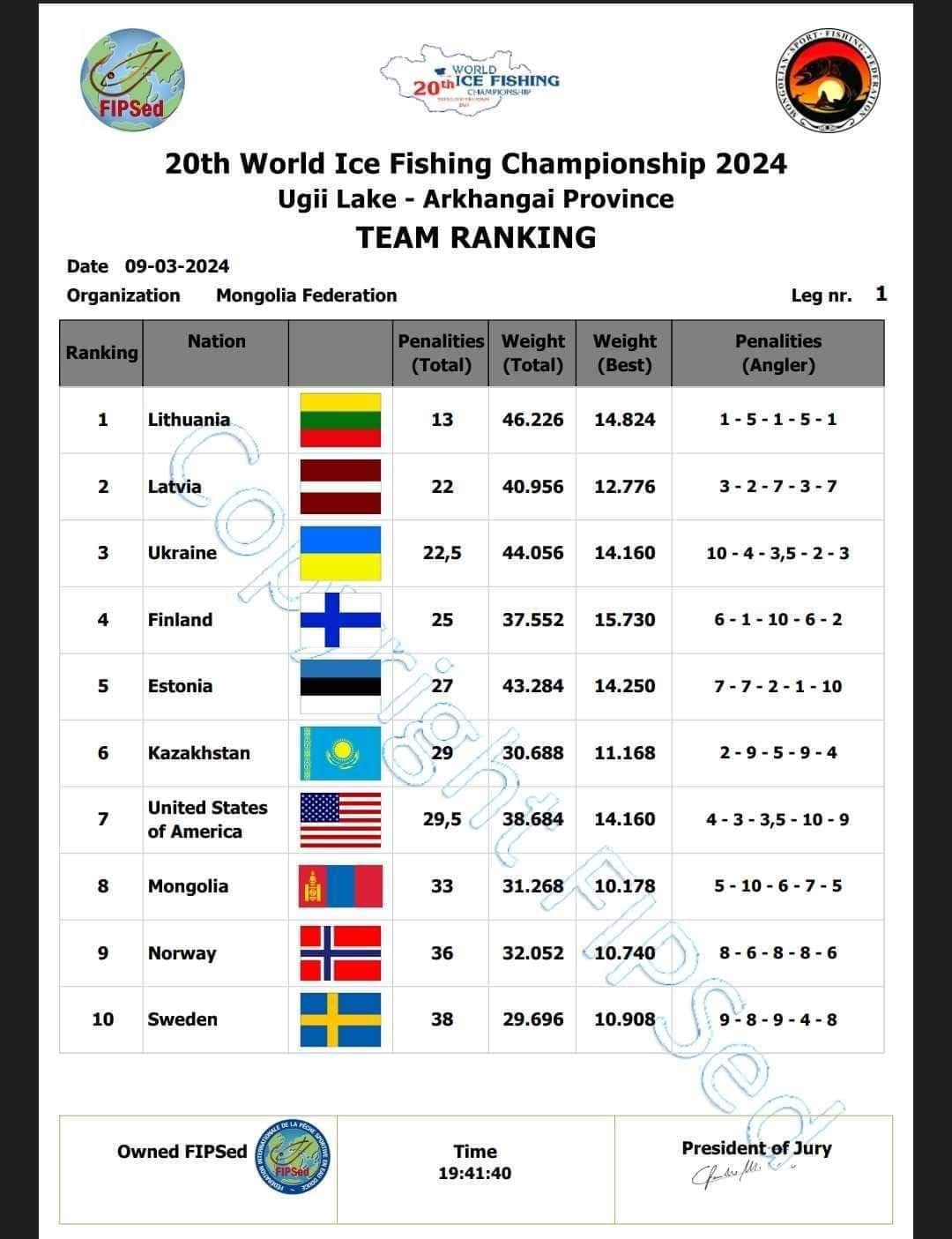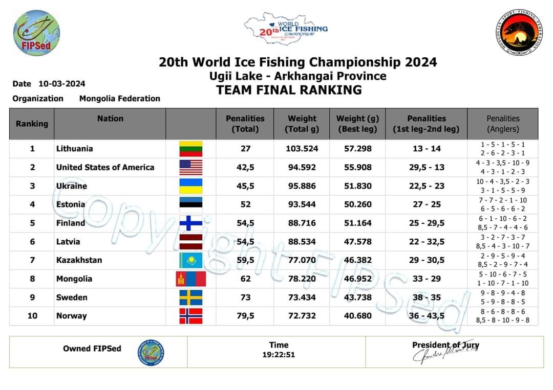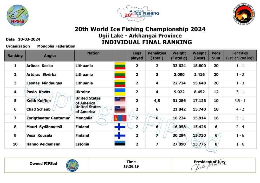 В личном зачете чемпион литовец Арунас Коска, серебро и бронза тоже у литовцев. Литовцы явно лучше всех разобрались с монгольской рыбой.