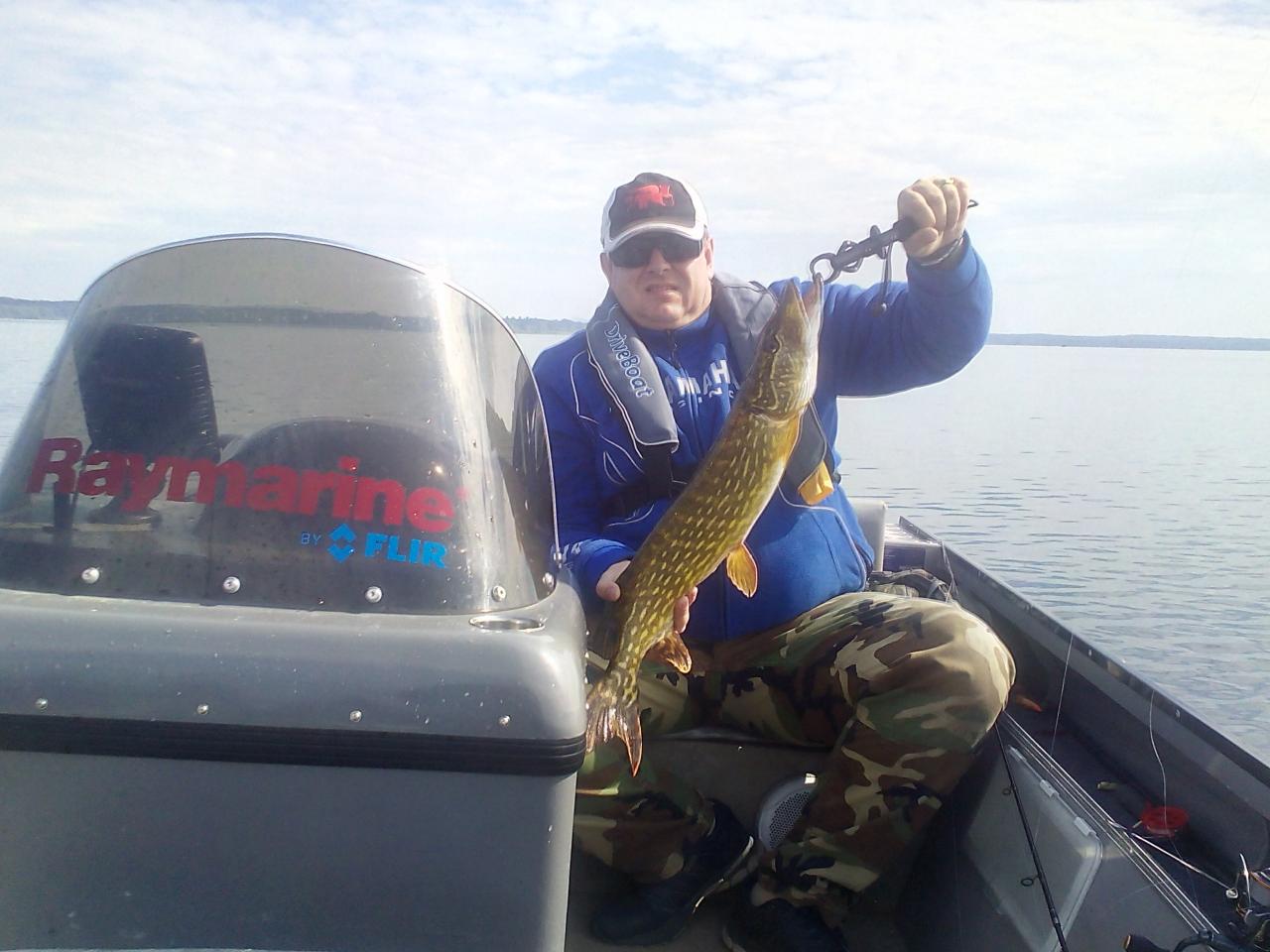 Потом направился чуть дальше - на косу с группой пригорков напротив " Зубрёнка " . Там как то сразу удачно встав между пригорками - дело пошло , поклёвок было по три - четыре с якоря. На воблер щука брала осторожно , вся за край губы на хвостовом крючке , и в связи с этим было много сходов , примерно половина рыб сходила или поклёвки были пустые - тычки . Обкидав вокруг лодки воблерами - ставил цикаду , и пробивал джигом , что тоже приносило пару - тройку поклёвок , но уже с реализацией близкой к полной , пустых поклёвок на неё почти не было . В итоге за зачётное время поймал пять зачётных щук и парочку окуней - по соревновательным меркам вроде и неплохо . Как потом оказалось ловил на точке " Мегаполисов " , они приехали и обматюкав немного :) встали рядом .